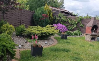 Pięknie zagospodarowany ogród z zadbaną zielenią i roślinami tworzy idealne miejsce do odpoczynku i spędzania czasu na świeżym powietrzu.