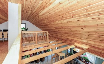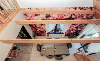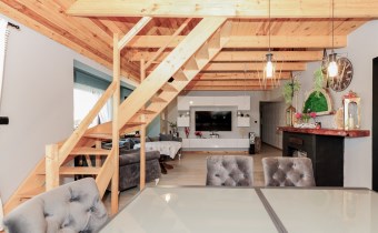 Na górną kondygnację prowadzą wygodne drewniane schody z balustradą .