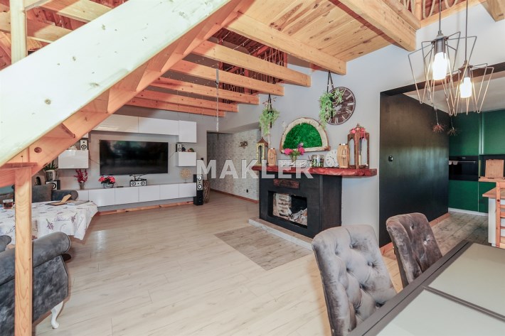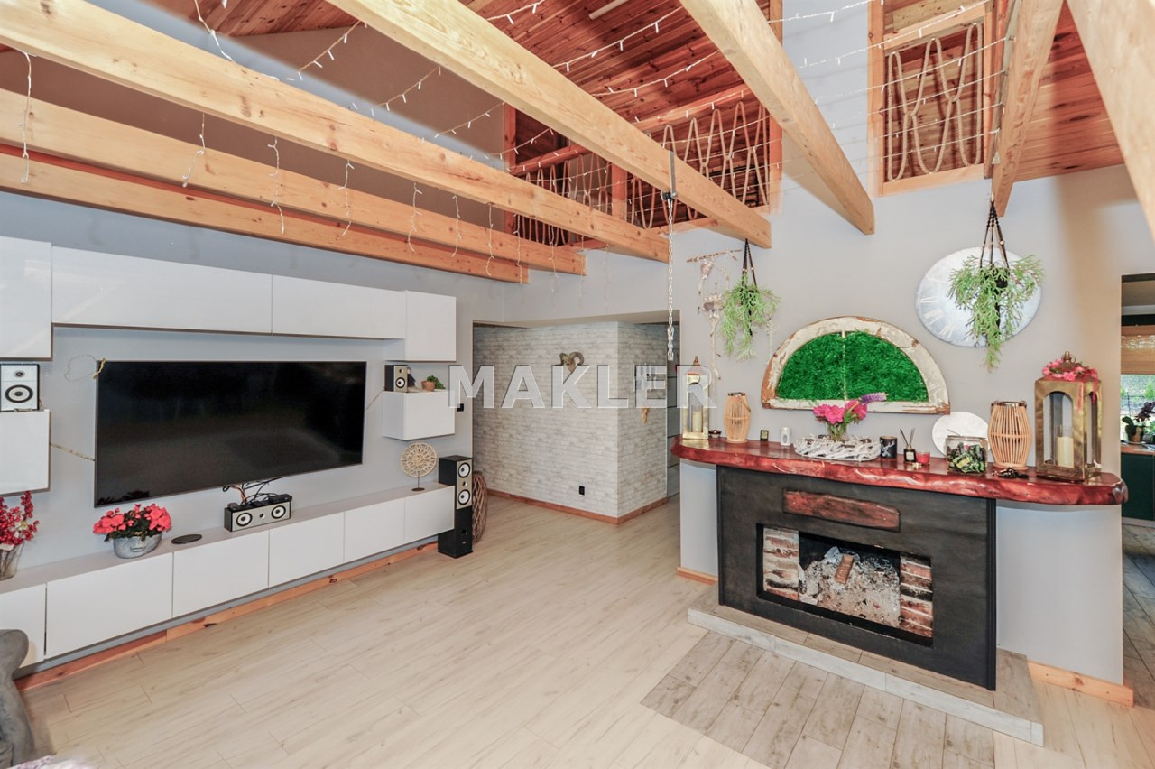 Na 181 metrowej przestrzeni użytkowej znajduje się przestronny salon z otwartym kominkiem, strefą wypoczynkową, jadalnią i wyjściem na duży taras i do ogrodu.