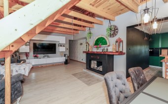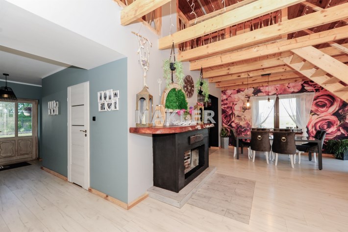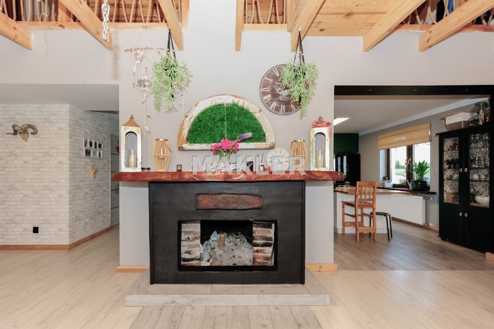 Cały dom tworzy niebanalną przestrzeń wyposażoną w pięknie dobrane do wnętrza meble. To doskonała nieruchomość dla klientów, którzy szukają czegoś wyjątkowego z dala od zgiełku dużego miasta.