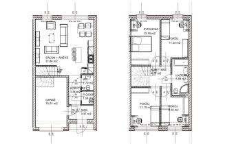 Trzy domy w zabudowie szeregowej w nowoczesnej willi mieszkaniowej. W parterze zlokalizowana przestrzeń dzienna z salonem, garażem, toaletą i pomieszczeniem gospodarczym. Na piętrach wybudowano cztery sypialnie i łazienkę.