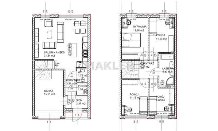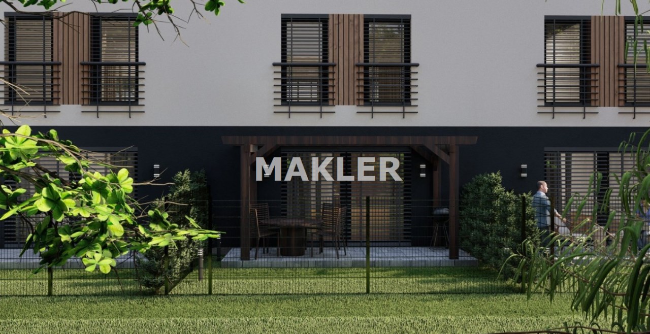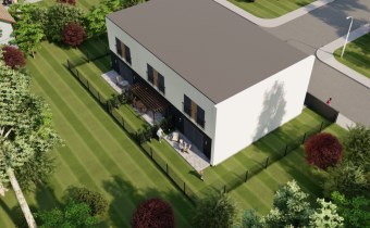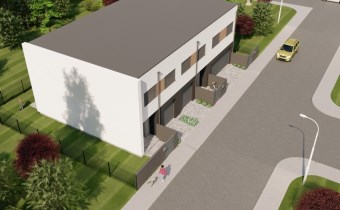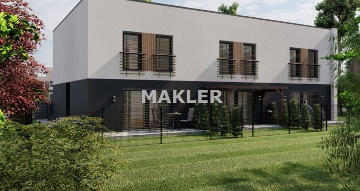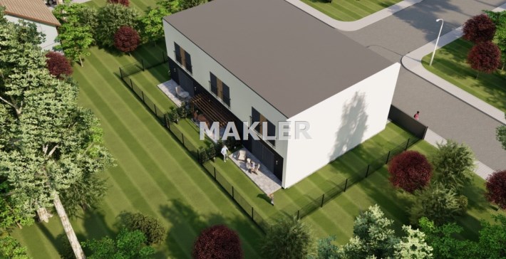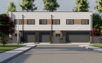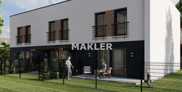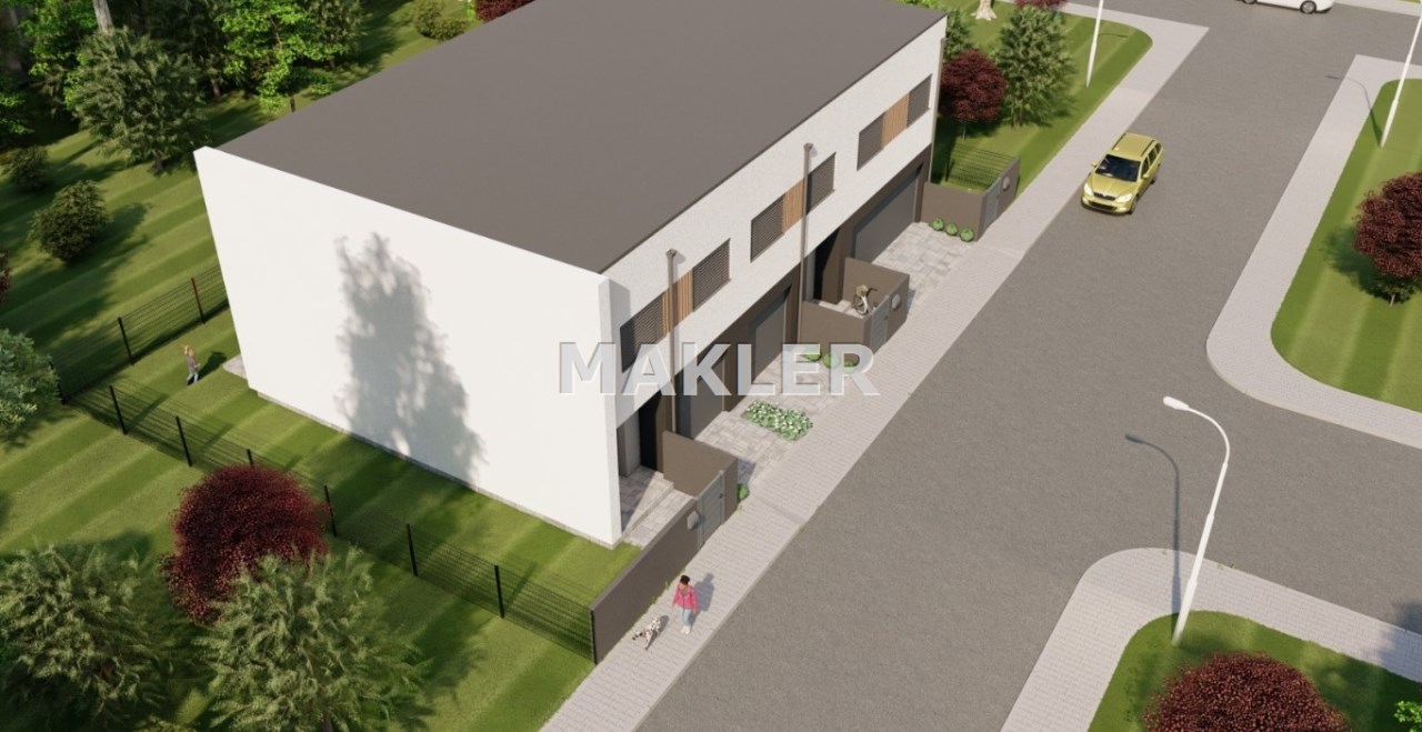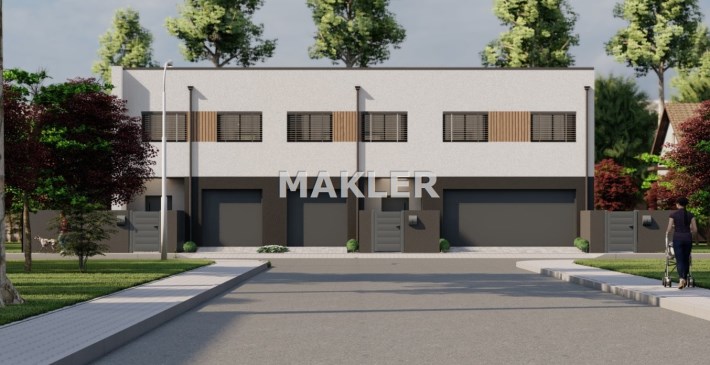 Trzy domy w zabudowie szeregowej w nowoczesnej willi mieszkaniowej. W parterze zlokalizowana przestrzeń dzienna z salonem, garażem, toaletą i pomieszczeniem gospodarczym. Na piętrach wybudowano cztery sypialnie i łazienkę.
