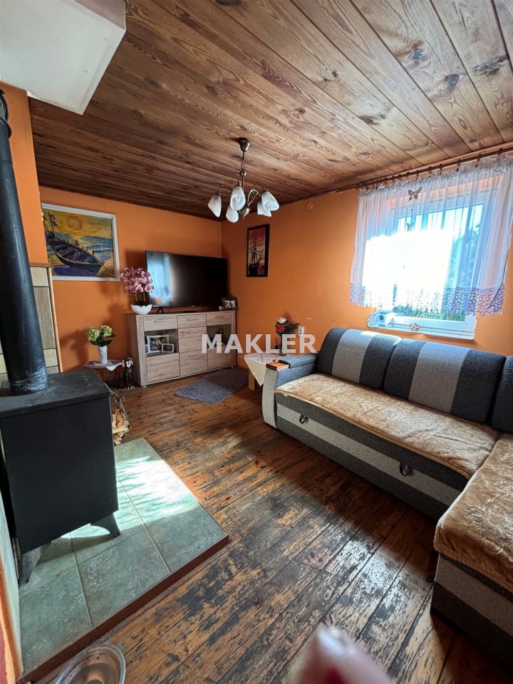 Działka o powierzchni 338m na której usytuowany jest dom o powierzchni 30m.Dół domu to kuchnia, pomieszczenie gospodarcze, natomiast góra to salon, sypialnia i łazienka.Dom ogrzewany kominkiem typu koza góra i dół.