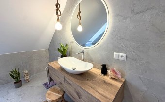 Salon wykończony elegancką dębową deską barlinecką. W części dziennej znajduje się koza, która tworzy przytulny klimat w sezonie jesienno-zimowym.