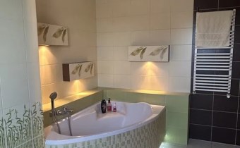 Komfort cieplny przez cały rok zapewnia pompa ciepła oraz kominek, który dodatkowo tworzy przytulny klimat w części dziennej. W łazienkach oraz wiatrołapie zastosowano ogrzewanie podłogowe, natomiast w pozostałych pomieszczeniach znajdują się grzejniki.