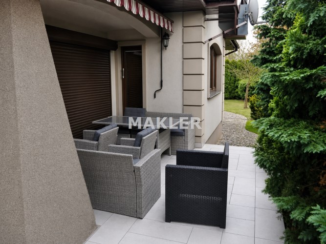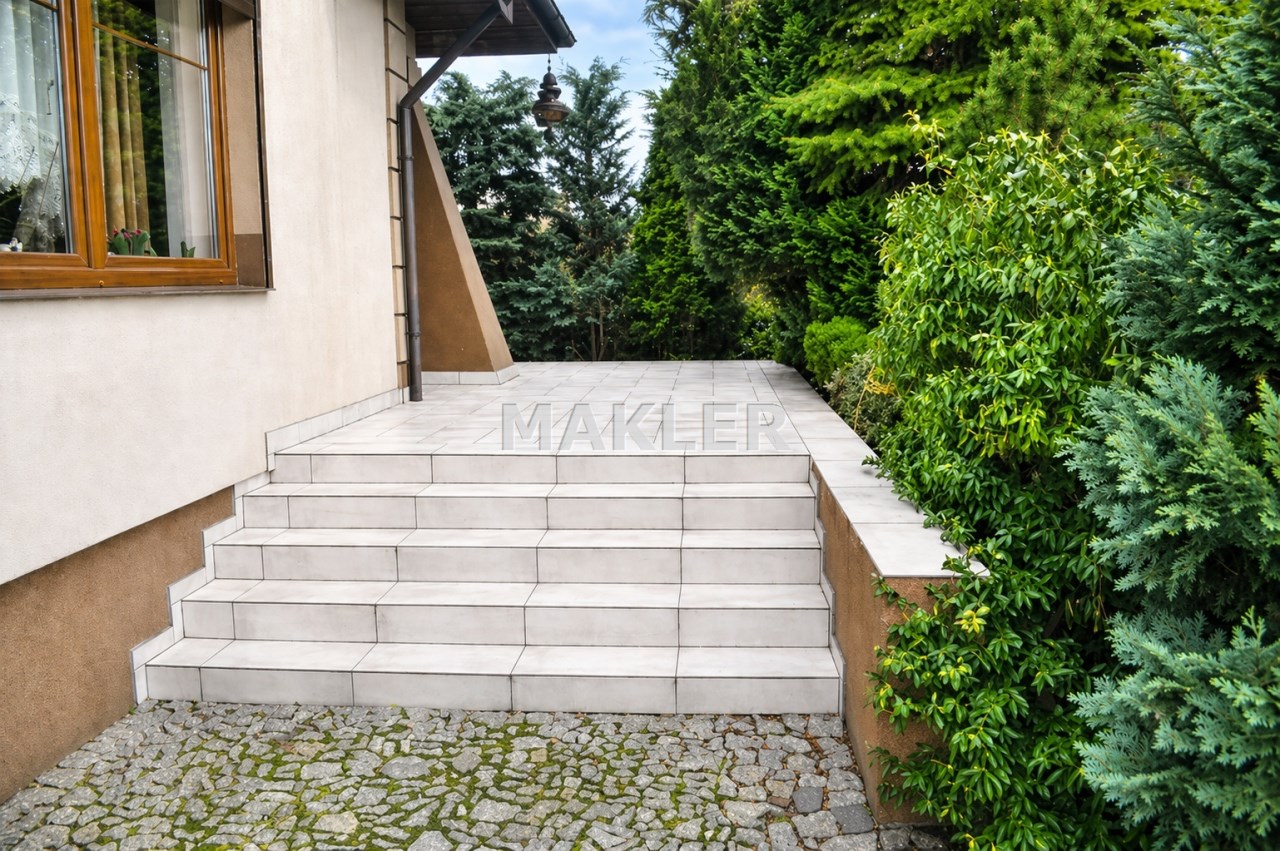 Posesja jest bardzo dobrze zagospodarowana, ogrodzona i otoczona zadbaną zielenią. Wokół całej działki znajdują się żywopłoty z grabu, ligustru i tui, zapewniające prywatność i estetyczne otoczenie. Na terenie nieruchomości znajduje się również drewniana szopka narzędziowa, wiata na samochód oraz wiata na drewno kominkowe mieszcząca około 15 m³ drewna.