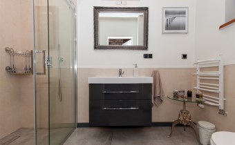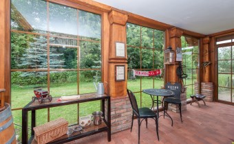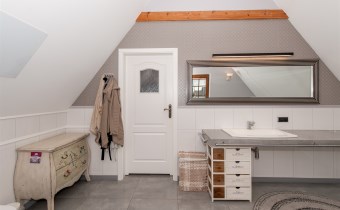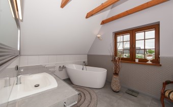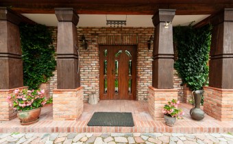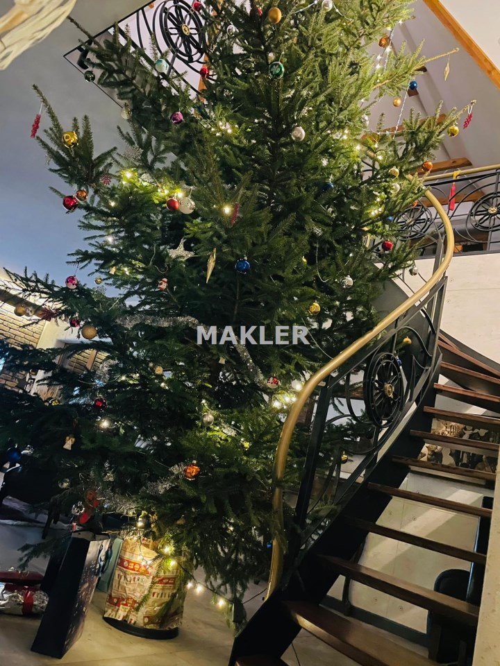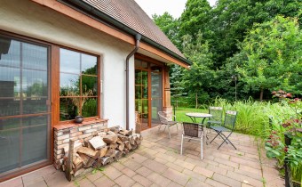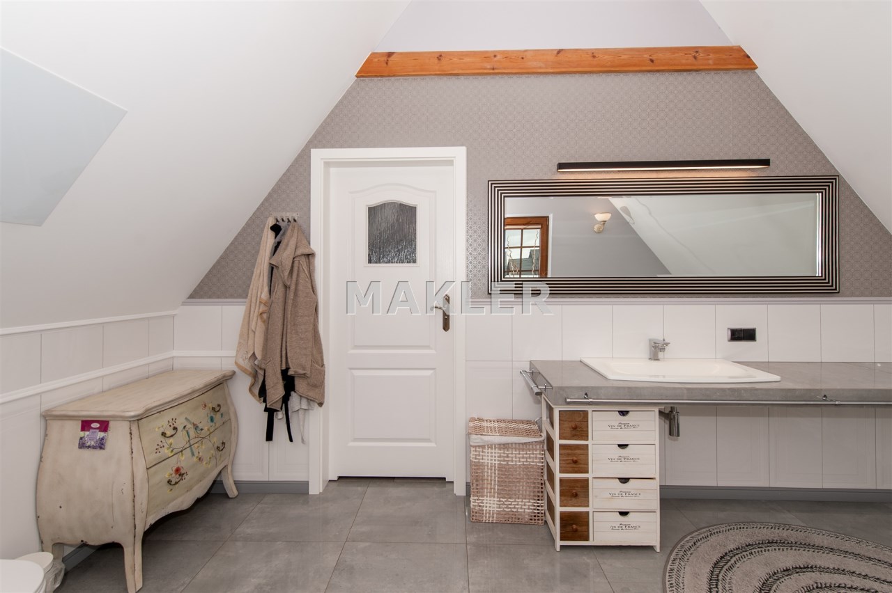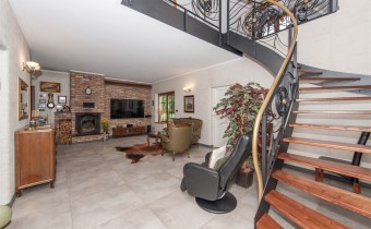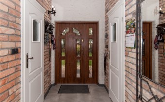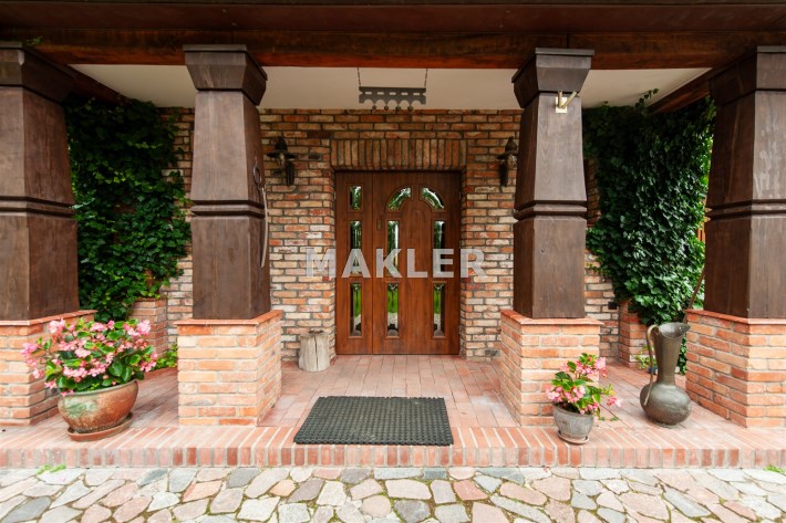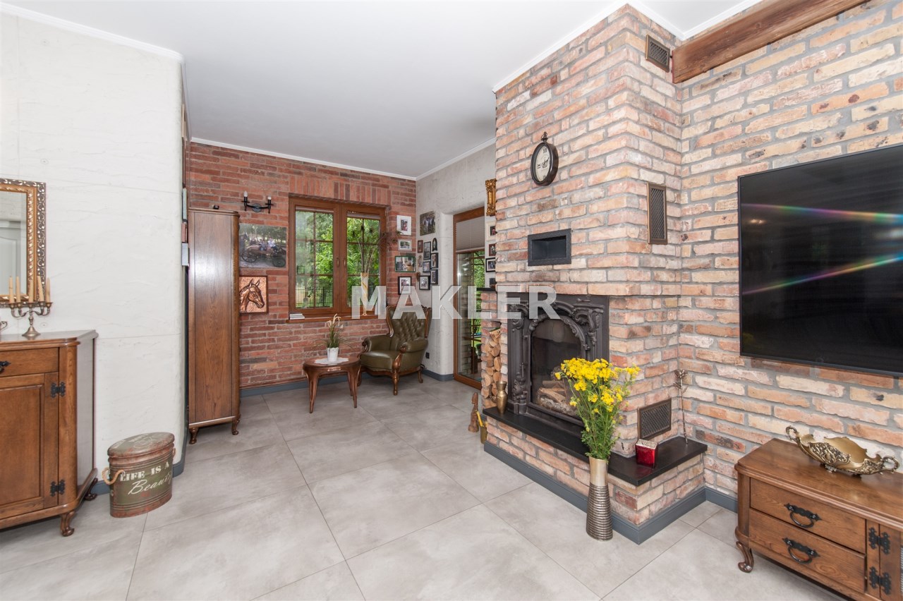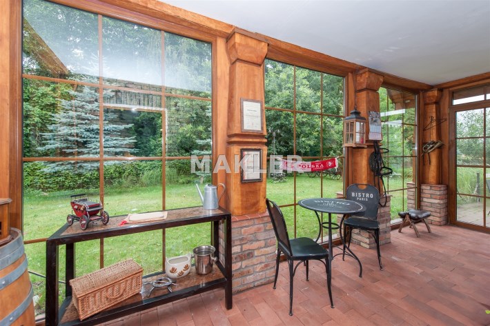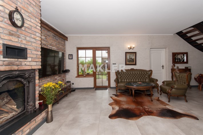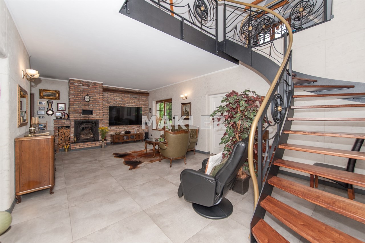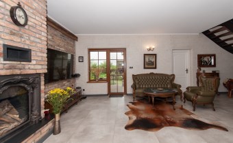 Podchodząc do głównego wejścia miniemy drewniane, rzeźbione kolumny, a przechodząc do wnętrza na końcu korytarza przywita nas obszerny jasny salon z kominkiem. Wyjątkowym elementem tego wnętrza są schody - wykonane w całości z kutego żelaza i naturalnego drewna. Ich łuk pozostawia przestrzeń ciągnącą się od podłogi aż do sklepienia znajdującego się na piętrze. Do tej pory, rok do roku, wykorzystywana była w okresie świąt do ustawiania tam ogromnej kilkumetrowej i ozdobionej choinki. Na parterze znajdziemy ponadto sypialnie dla gości, dużą kuchnię ze spiżarnią, łazienkę, przejście na całoroczną werandę, oraz wejście na taras z widokiem na staw. Na piętrze znajdują się 3 sypialnie (w tym jedna obecnie pełniąca rolę ogromnej garderoby), łazienka ze stylową wanną oraz niewielka przestrzeń pełniąca rolę siłowni.
