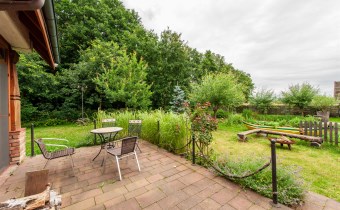 Podchodząc do głównego wejścia miniemy drewniane, rzeźbione kolumny, a przechodząc do wnętrza na końcu korytarza przywita nas obszerny jasny salon z kominkiem. Wyjątkowym elementem tego wnętrza są schody - wykonane w całości z kutego żelaza i naturalnego drewna. Ich łuk pozostawia przestrzeń ciągnącą się od podłogi aż do sklepienia znajdującego się na piętrze. Do tej pory, rok do roku, wykorzystywana była w okresie świąt do ustawiania tam ogromnej kilkumetrowej i ozdobionej choinki. Na parterze znajdziemy ponadto sypialnie dla gości, dużą kuchnię ze spiżarnią, łazienkę, przejście na całoroczną werandę, oraz wejście na taras z widokiem na staw. Na piętrze znajdują się 3 sypialnie (w tym jedna obecnie pełniąca rolę ogromnej garderoby), łazienka ze stylową wanną oraz niewielka przestrzeń pełniąca rolę siłowni.