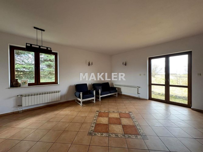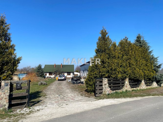 Na działce o powierzchni 5055 m² znajduje się dom mieszkalny z 2007 roku, duży garaż, budynek magazynowo-gospodarczy oraz staw z pomostem, który nadaje posesji wyjątkowego charakteru.