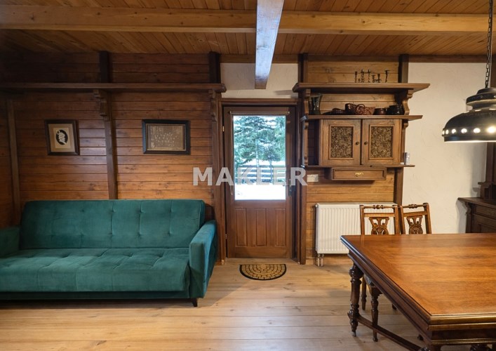 Na działce znajduje się również wolnostojący budynek garażowo-gospodarczy o powierzchni 39 m² z wiatą, ogrzewany z tego samego źródła co dom. Teren jest w pełni ogrodzony drewnianym ogrodzeniem i starannie zagospodarowany – liczne nasadzenia, drzewa, krzewy oraz kamienne ścieżki tworzą niepowtarzalny, klimatyczny charakter posesji.