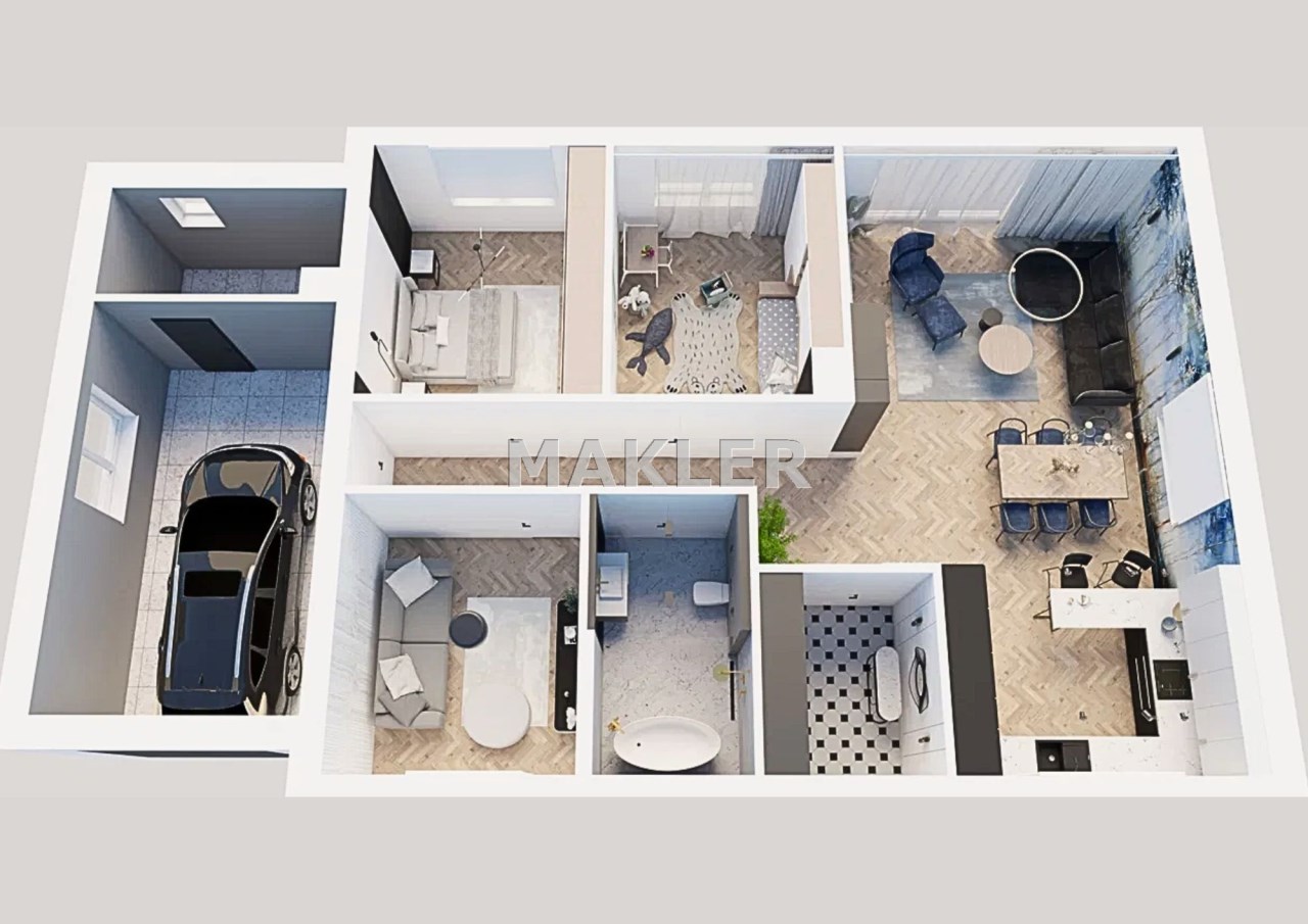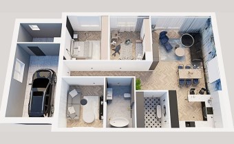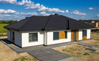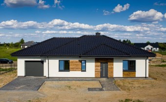 Dom zaprojektowany został z myślą o komforcie codziennego życia – funkcjonalny, parterowy układ zapewnia wygodę użytkowania bez barier architektonicznych. Cztery pokoje dają szerokie możliwości aranżacyjne: komfortowa strefa dzienna z salonem oraz przestrzeń prywatna obejmująca sypialnie i gabinet lub pokój dla dziecka.