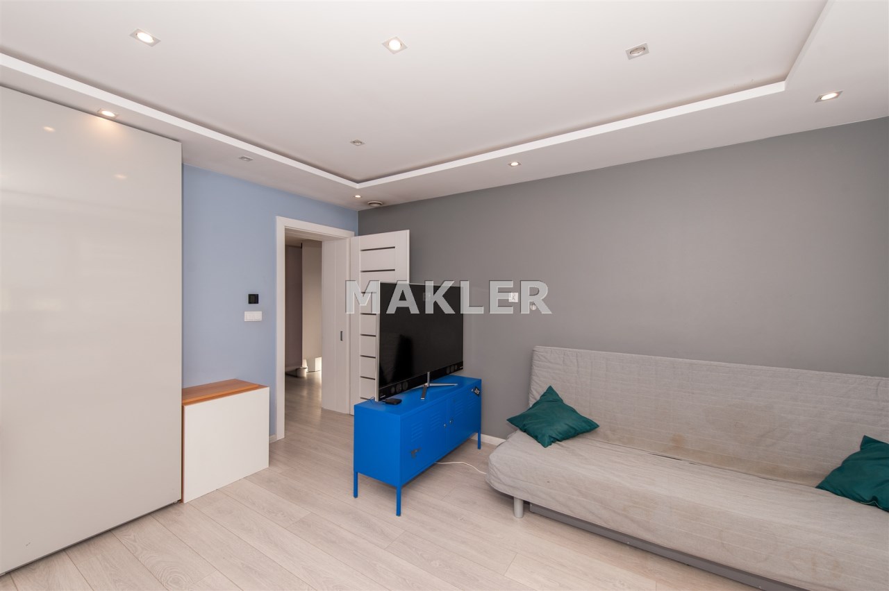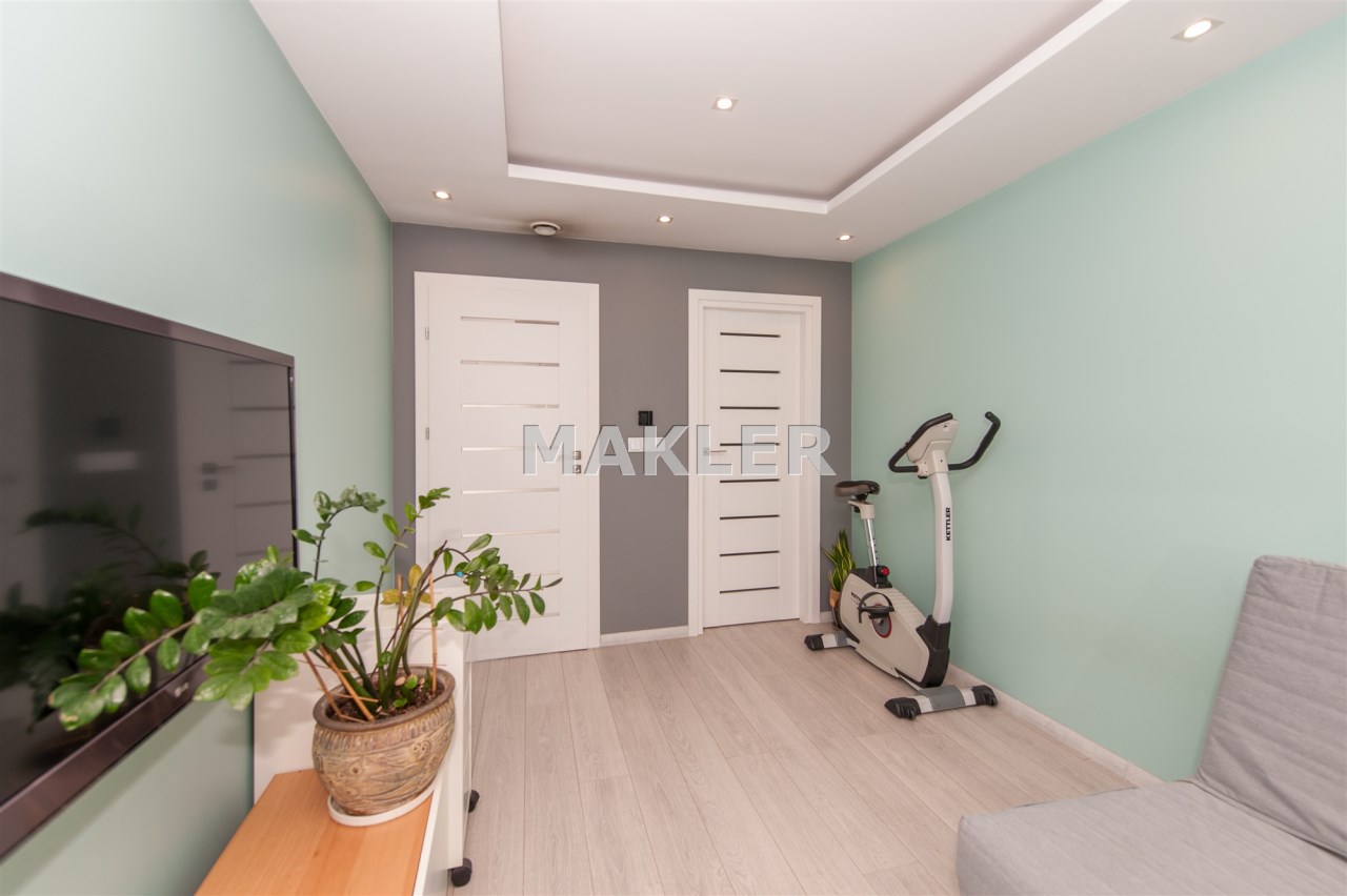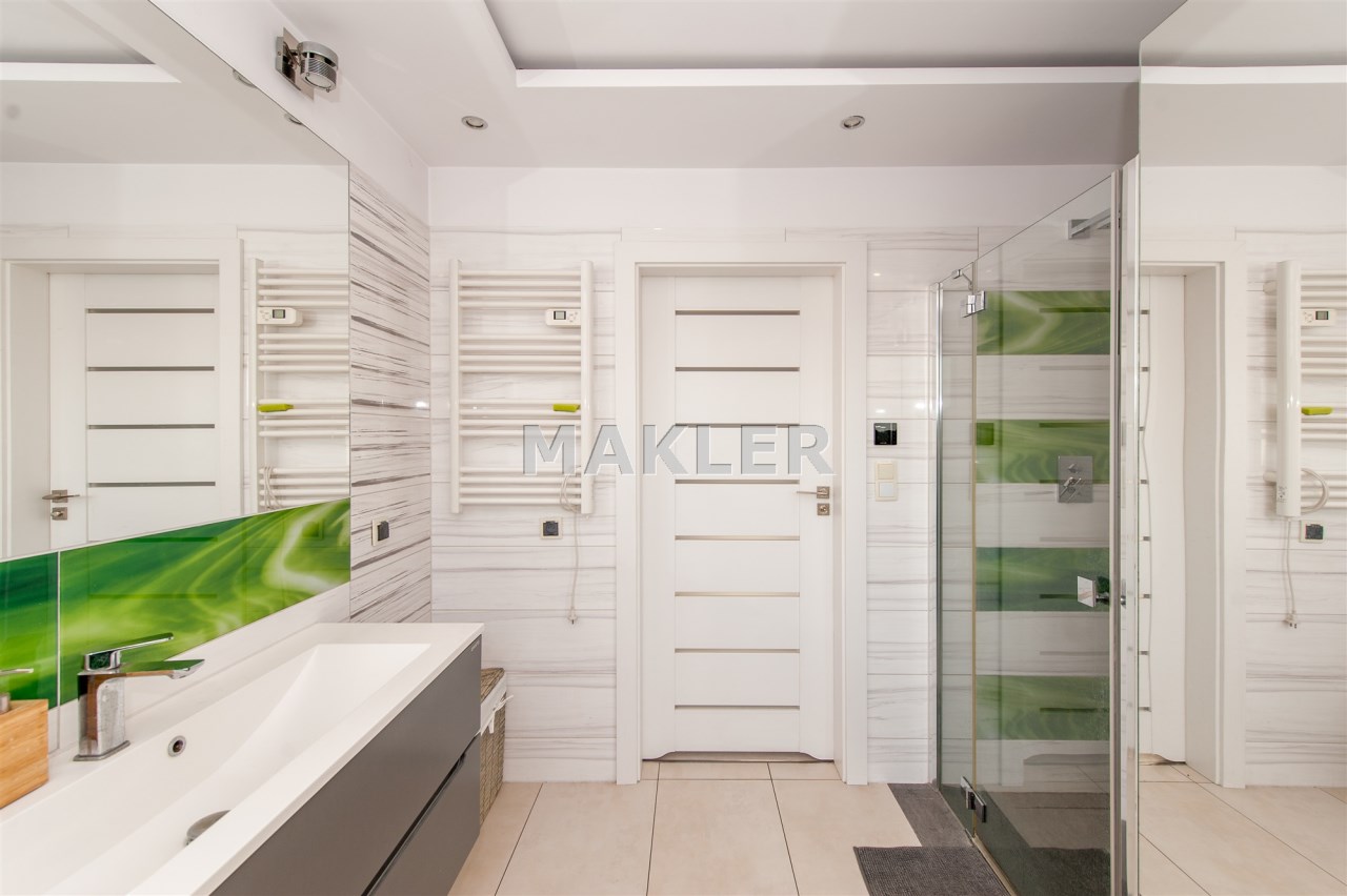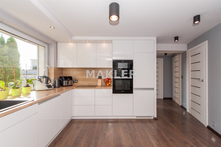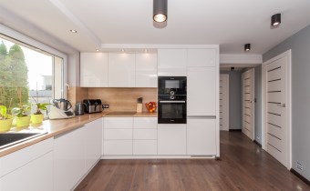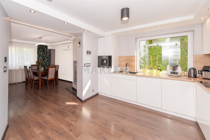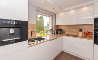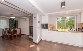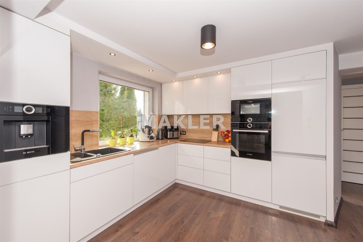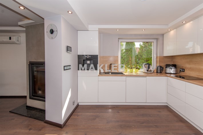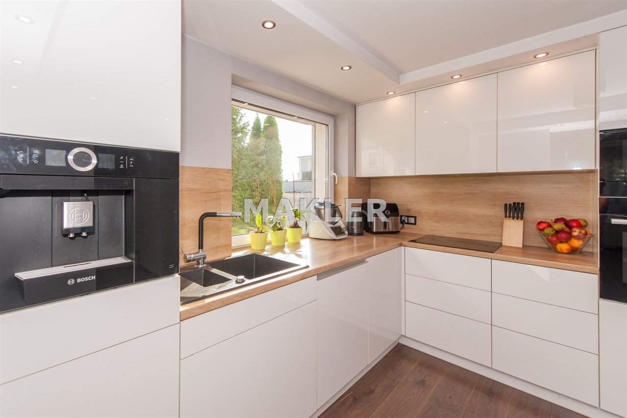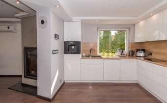 Kuchnia w pełni wyposażona w sprzęt AGD który oczywiście pozostaje tj.lodówka,piec,mikrofala,ekspres do kawy w zabudowie,zmywarka,okap,płyta indukcyjna.
