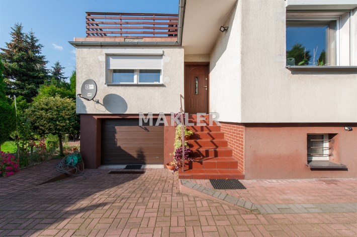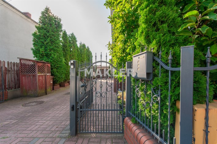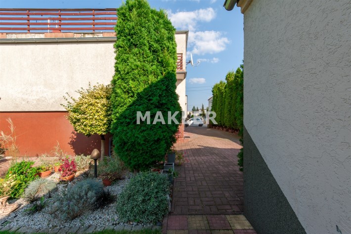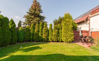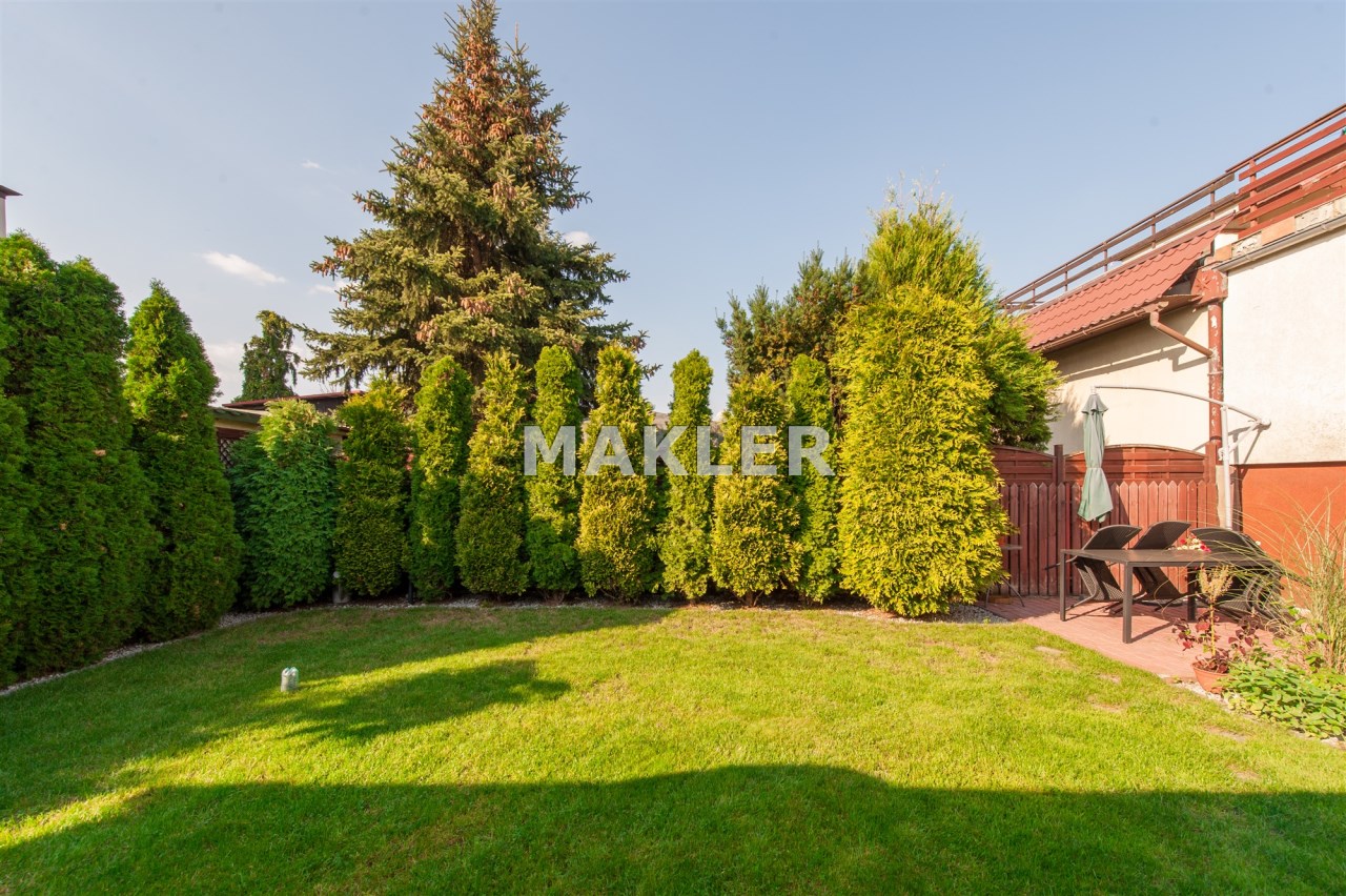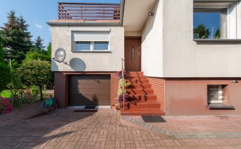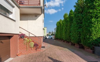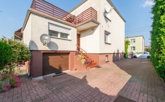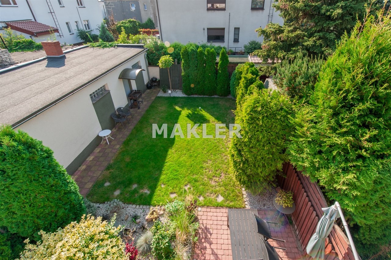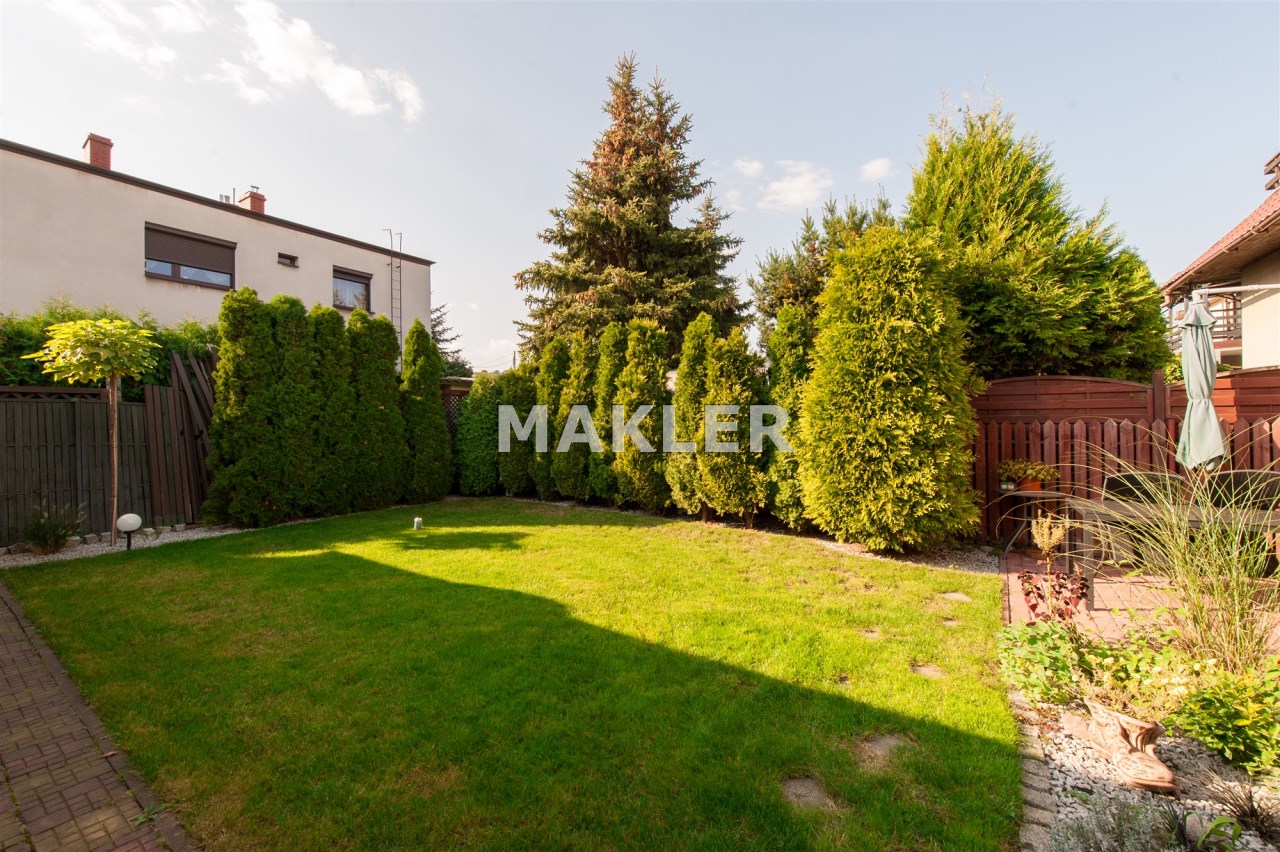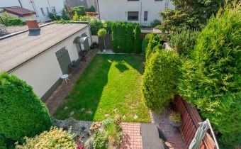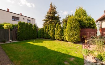 Dom w zabudowie blizniaczej z pięknie zagospodarowanym ogródkiem, wieloletnie obsadzenia.Dom o powierzchni 180m składa się z salonu, kuchni, sypialni,łazienki,szatni, natomiast góra dom to dwie sypialnie ,garderoba,łazienka, przestronny korytarz z wyjściem na duży taras.