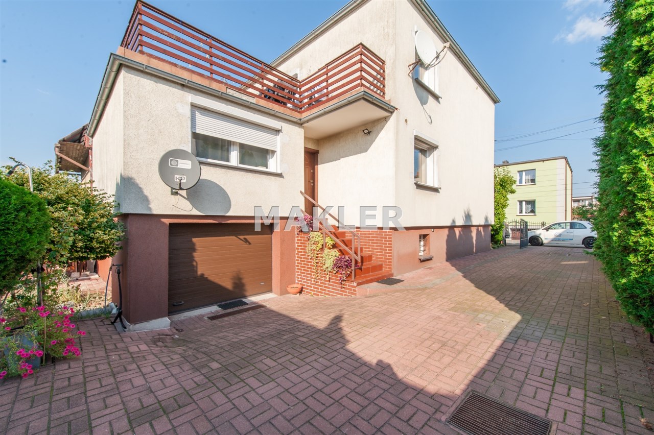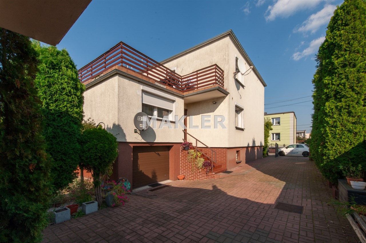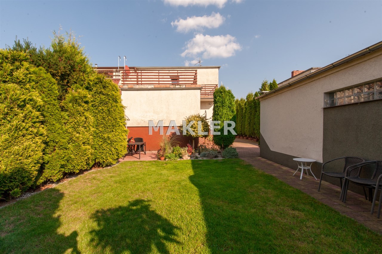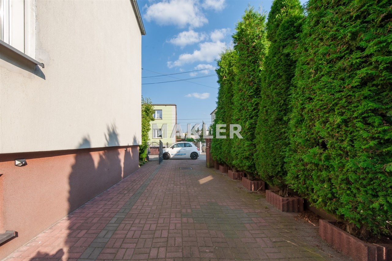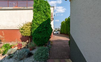 Dom w zabudowie blizniaczej z pięknie zagospodarowanym ogródkiem, wieloletnie obsadzenia.Dom o powierzchni 180m składa się z salonu, kuchni, sypialni,łazienki,szatni, natomiast góra dom to dwie sypialnie ,garderoba,łazienka, przestronny korytarz z wyjściem na duży taras.