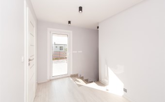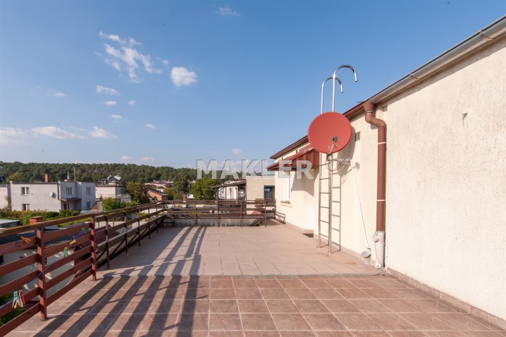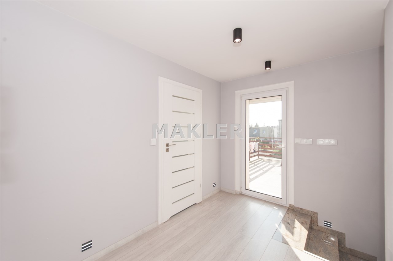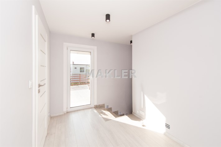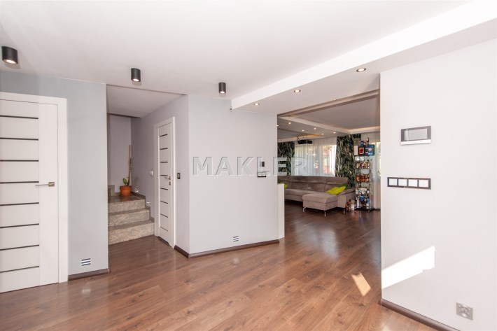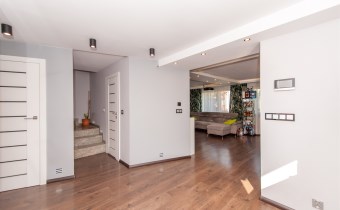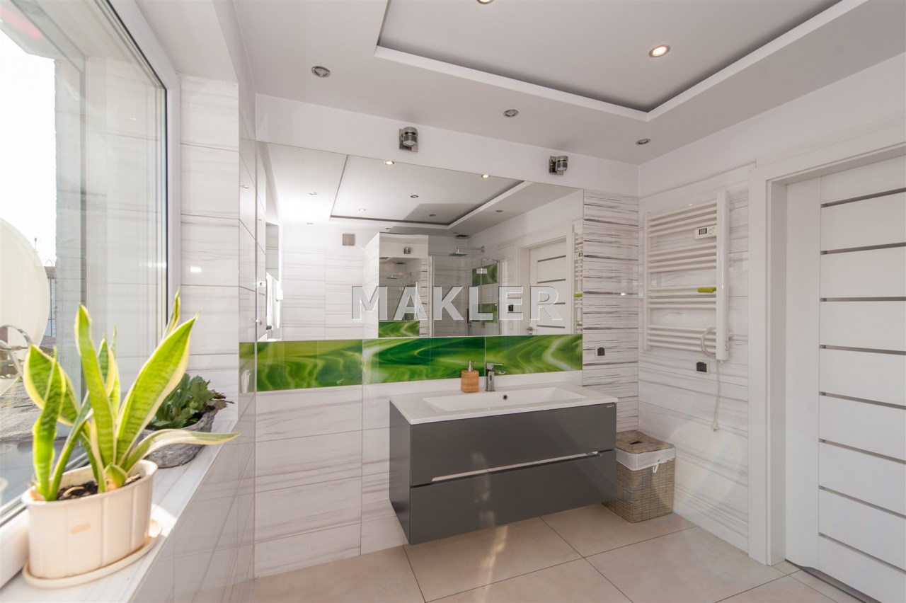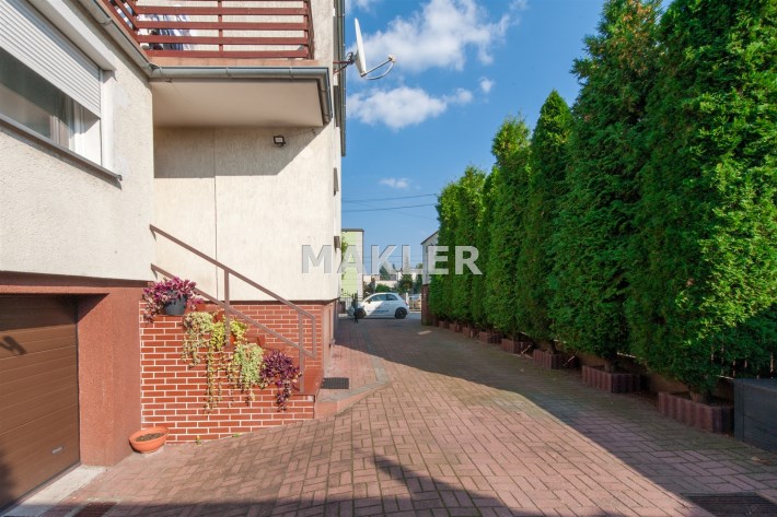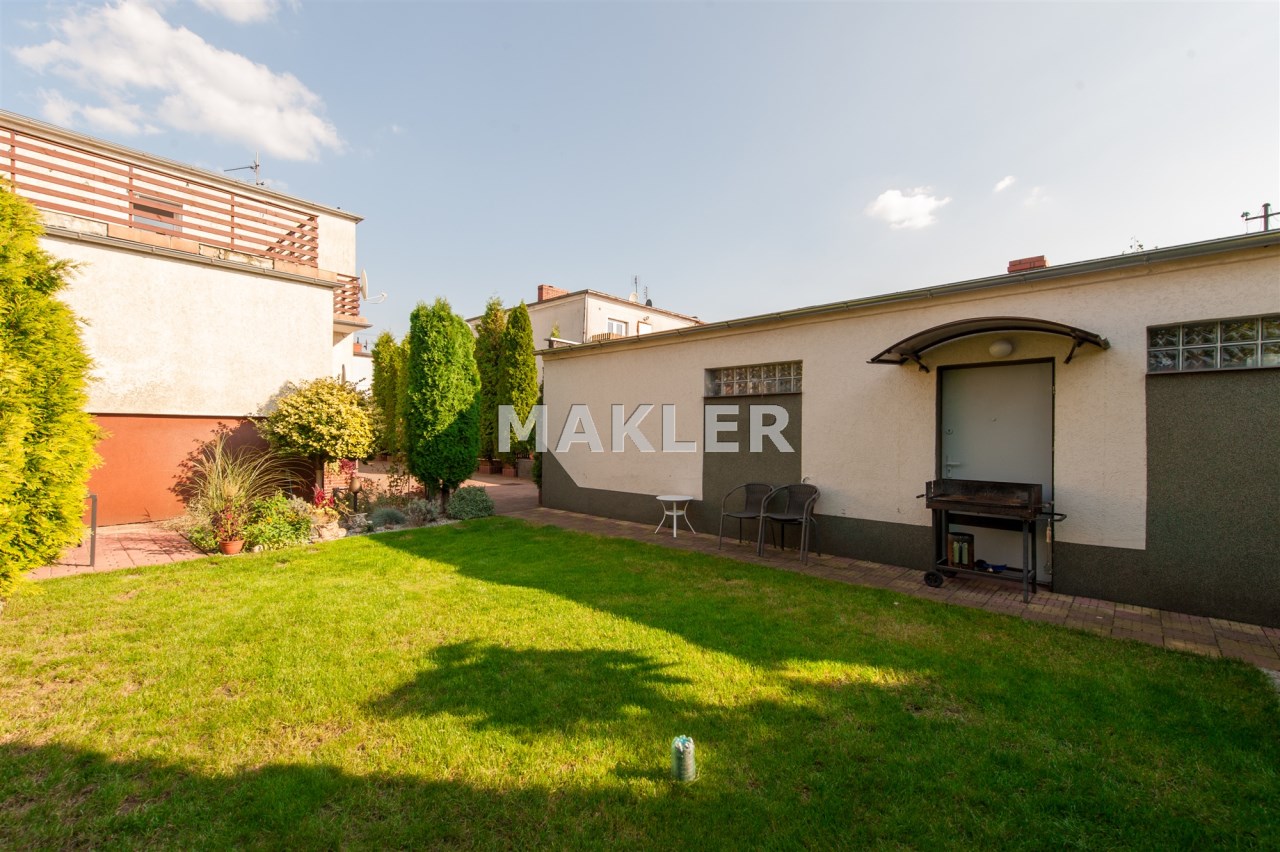 Dom w zabudowie blizniaczej z pięknie zagospodarowanym ogródkiem, wieloletnie obsadzenia.Dom o powierzchni 180m składa się z salonu, kuchni, sypialni,łazienki,szatni, natomiast góra dom to dwie sypialnie ,garderoba,łazienka, przestronny korytarz z wyjściem na duży taras.