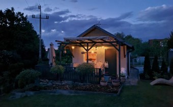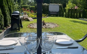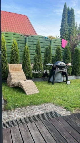 Domek w pełni wyposażony w kuchenkę gazową wraz meblami, stół z krzesłami, narożnik oraz szafkę RTV.
