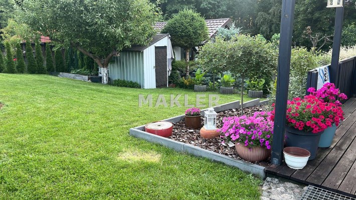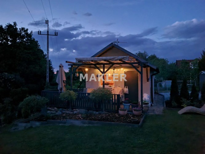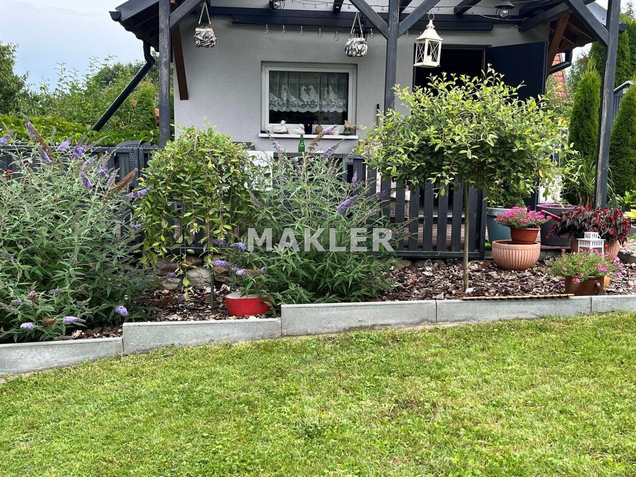 Na działce 311 m2 posadowiony jest 6 letni domek szkieletowy ocieplony styropianem z tarasem.