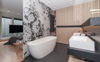 Na górze do Państwa dyspozycji jest przestronna sypialnia wraz z dużą garderobą. Małżeńskie, komfortowe łoże z zagłówkiem z printem na ścianie zestawionym z lamelami. Całość nabiera trójwymiarowego efektu. Za drzwiami sypialni kryje się komfortowa łazienka wyposażona w wygodny prysznic oraz wolnostojącą wannę. To miejsce, które zagwarantuje Państwu wypoczynek w komfortowych warunkach. Należy zwrócić uwagę na przemyślane oświetlenie w całym apartamencie, które pozwala odpowiednio nakierować światło w zależności od Państwa potrzeb do pracy lub relaksu co ma znaczący wpływ na komfort. Kolorystyka bieli, drewna, czerni oraz betonu sprawia, że już po przekroczeniu progu czujemy się tu bardzo przyjemnie.