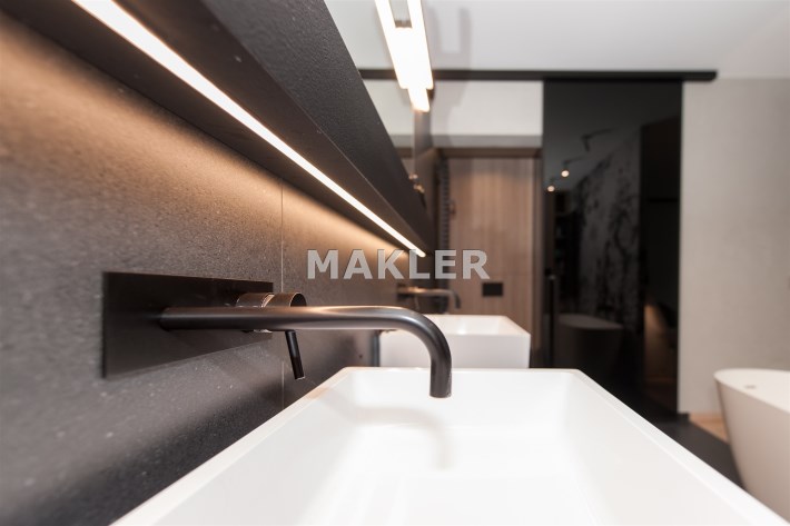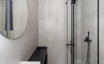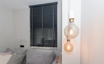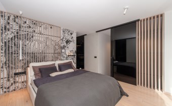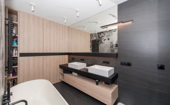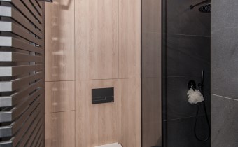 Na górze do Państwa dyspozycji jest przestronna sypialnia wraz z dużą garderobą. Małżeńskie, komfortowe łoże z zagłówkiem z printem na ścianie zestawionym z lamelami. Całość nabiera trójwymiarowego efektu. Za drzwiami sypialni kryje się komfortowa łazienka wyposażona w wygodny prysznic oraz wolnostojącą wannę. To miejsce, które zagwarantuje Państwu wypoczynek w komfortowych warunkach. Należy zwrócić uwagę na przemyślane oświetlenie w całym apartamencie, które pozwala odpowiednio nakierować światło w zależności od Państwa potrzeb do pracy lub relaksu co ma znaczący wpływ na komfort. Kolorystyka bieli, drewna, czerni oraz betonu sprawia, że już po przekroczeniu progu czujemy się tu bardzo przyjemnie.