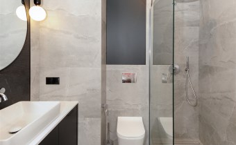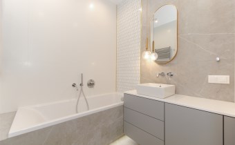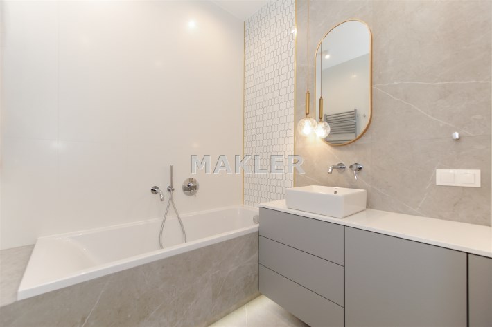 W mieszkaniu są 2 łazienki przy czym jedna przynależna do jednej z sypialni.Jedna z łazienek posiada wannę a druga kabinę prysznicową.