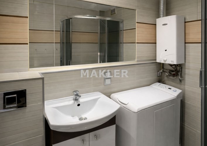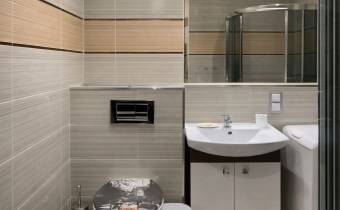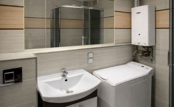 Łazienka została zaprojektowana funkcjonalnie i estetycznie. Znajduje się tu kabina prysznicowa, pralka, dużo miejsca do przechowywania kosmetyków oraz gazowy podgrzewacz wody.