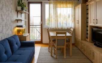 dwa ustawne pokoje, w tym większy z wyjściem na zadaszony balkon z płytkami,