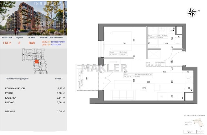 Przedstawiamy 2 pokojowe, mieszkanie o powierzchni 29,81m2 na 3 piętrze nowoczesnego bloku z windą i balkonem.