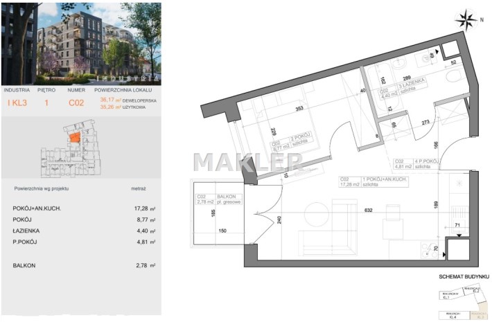 Przedstawiamy 2 pokojowe, mieszkanie o powierzchni 35,26m2 na 1 piętrze nowoczesnego bloku z windą i balkonem.