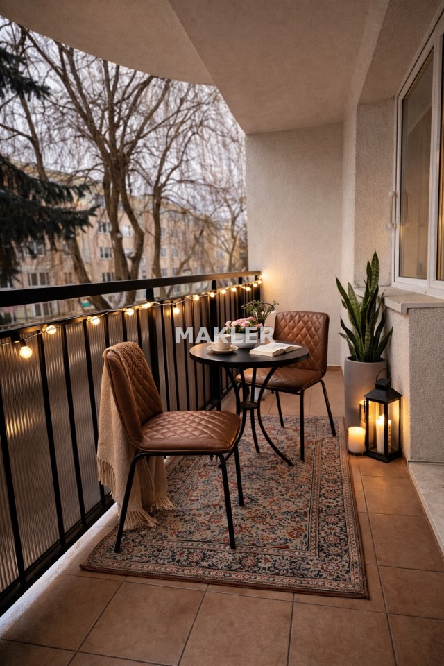 Duży balkon pozwala nie tylko wysuszyć pranie gdy jest słonecznie lecz również stworzyć miłe miejsce do wypicia porannej kawy w zaciszu domu.