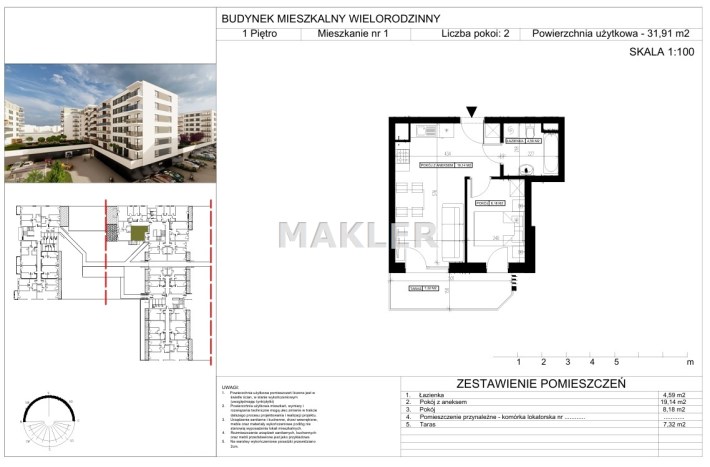 Przedstawiamy 2 pokojowe mieszkanie o powierzchni 34,45 m2 na 1 piętrze bloku z cichą windą.
