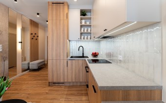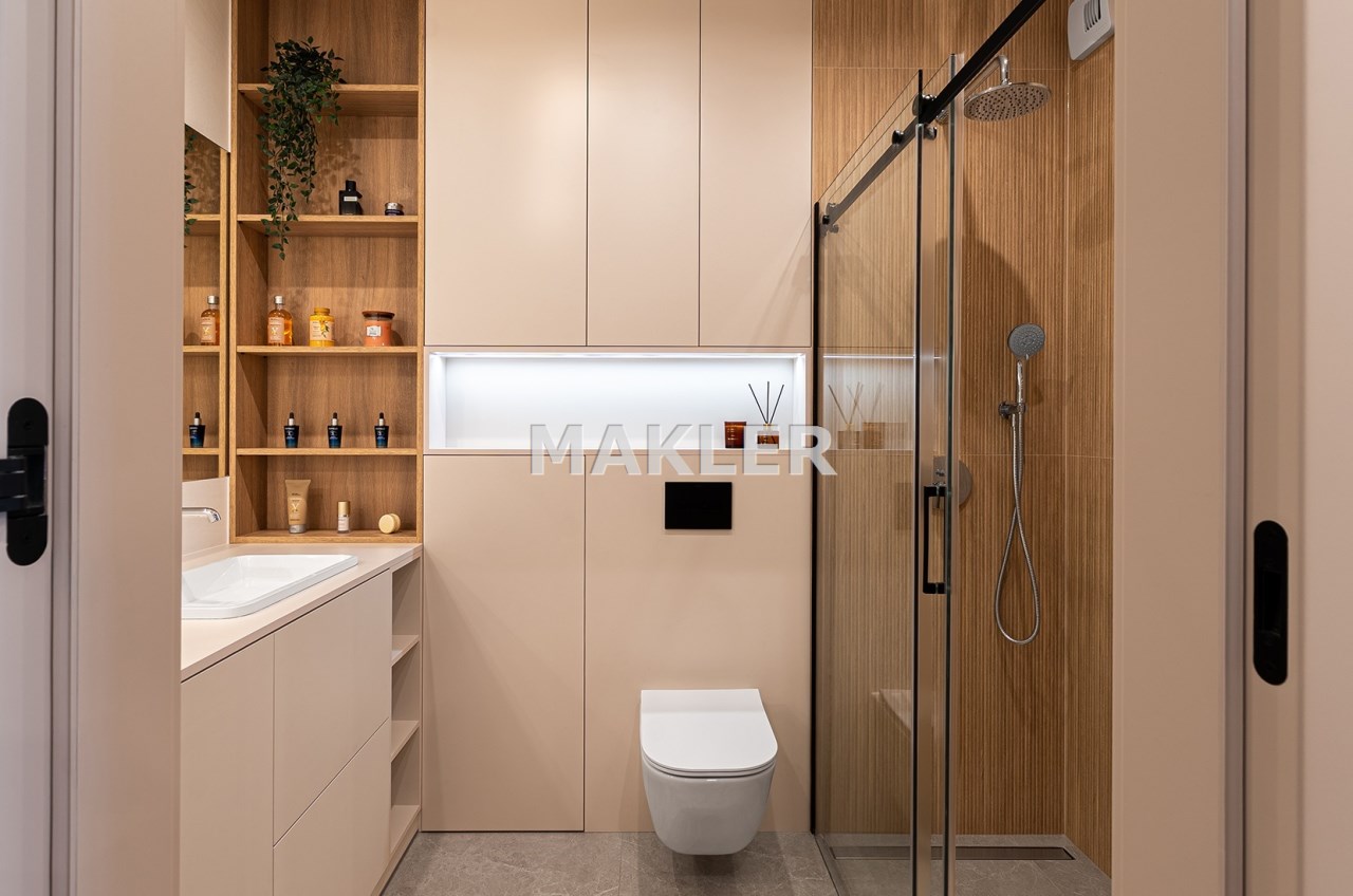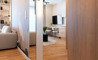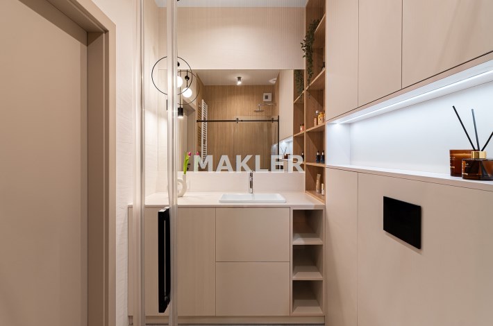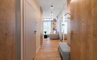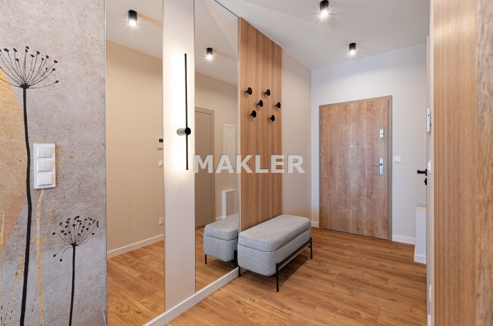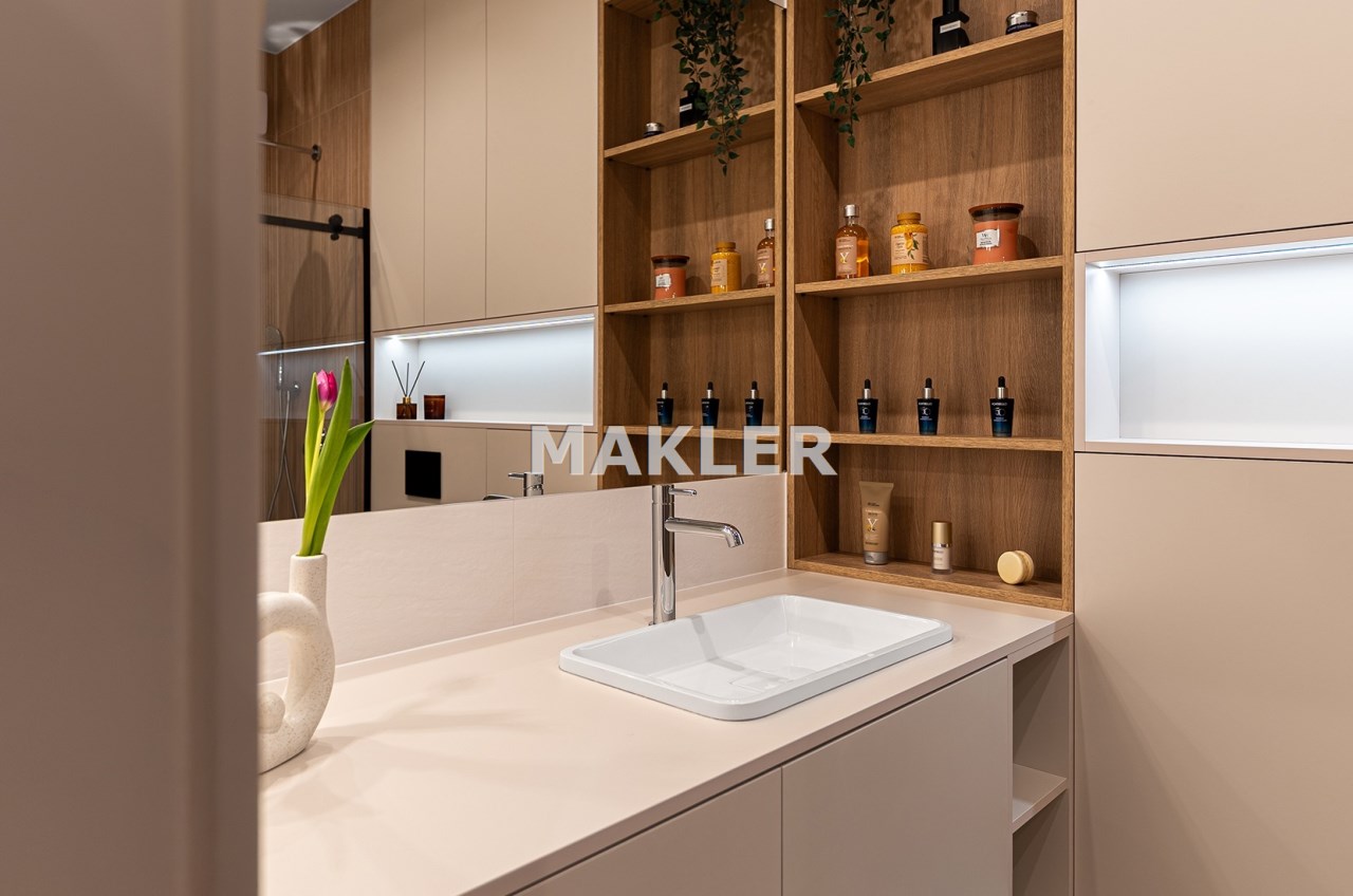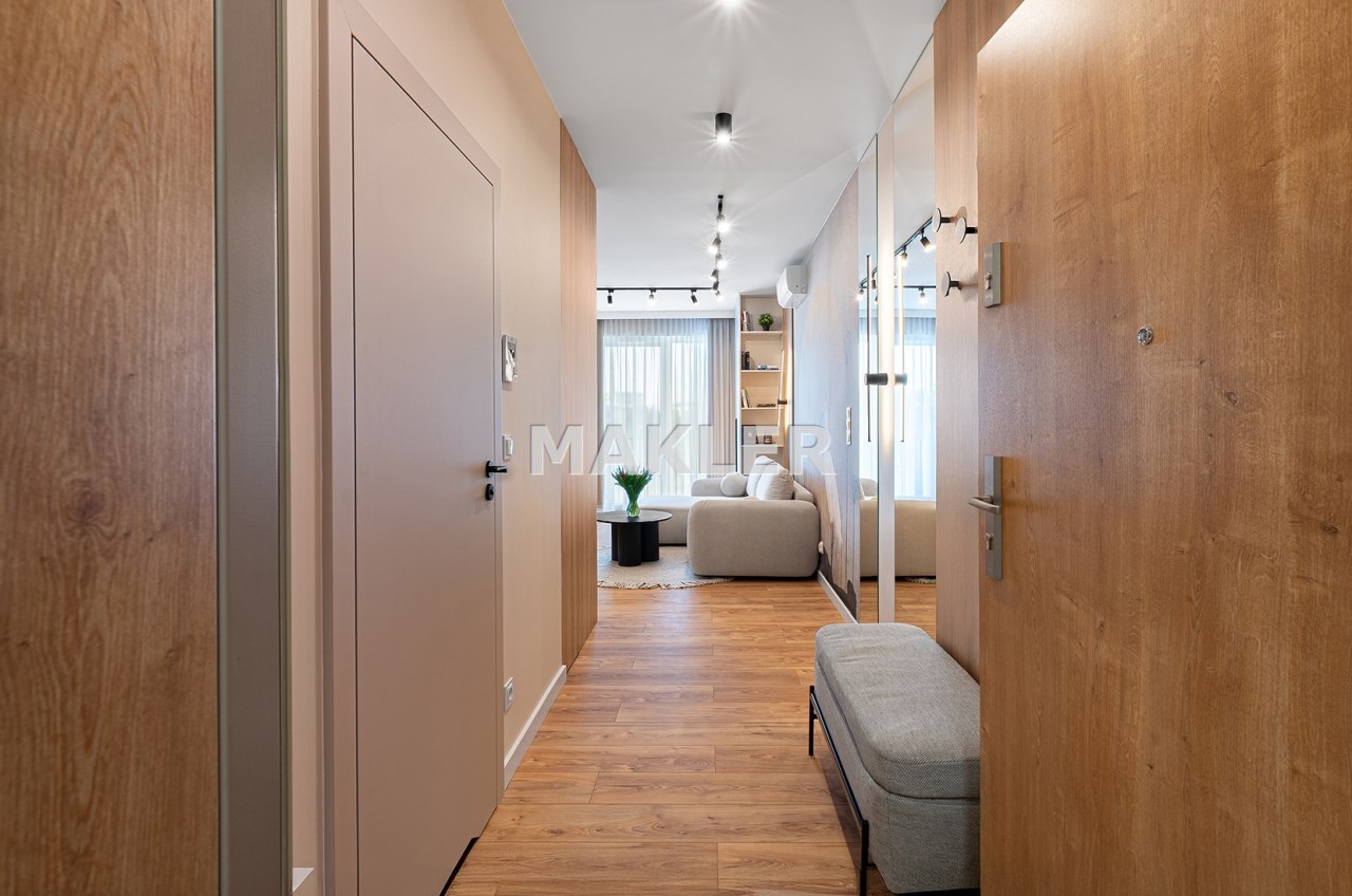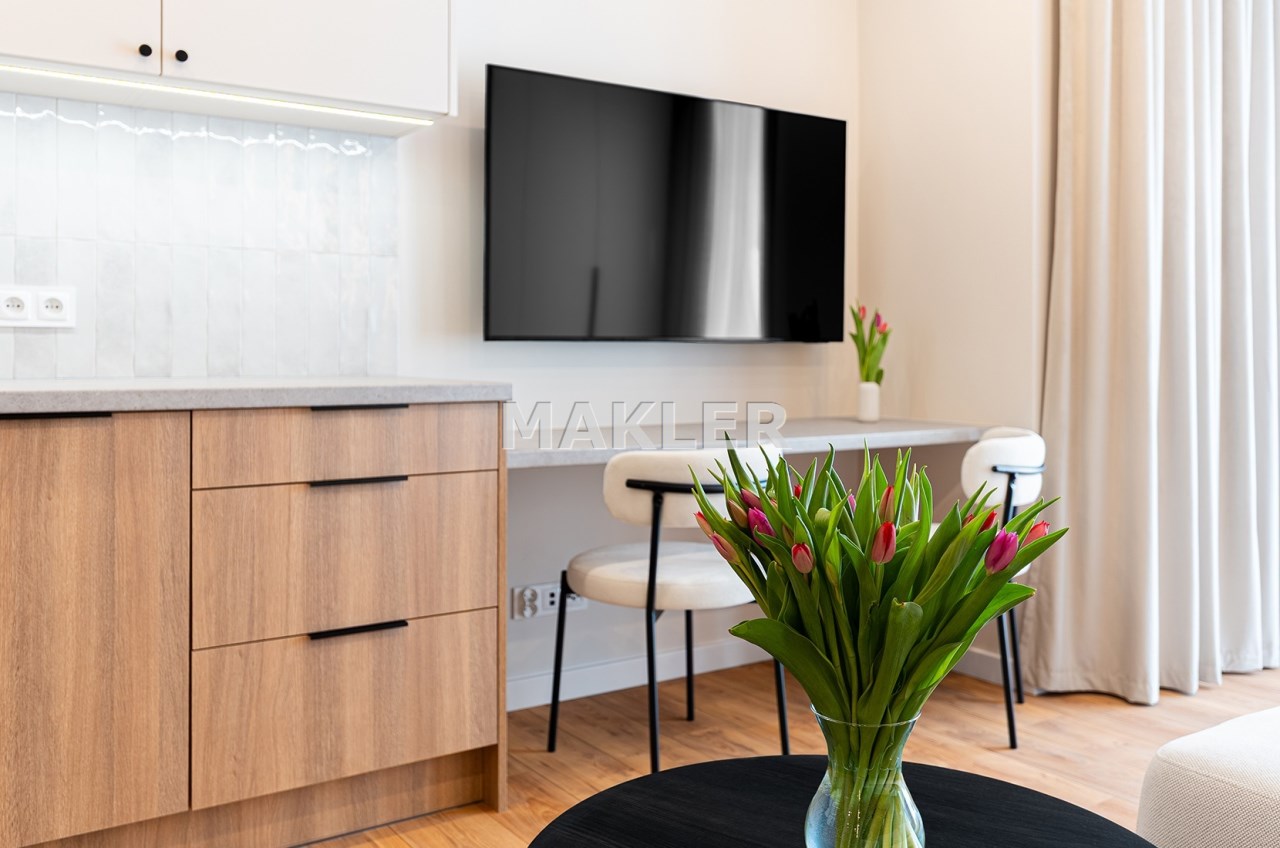 Mieszkanie zostało zaprojektowane przez architekta wnętrz i wykończone w wysokim standardzie z wykorzystaniem dobrej jakości materiałów. Przemyślany układ funkcjonalny obejmuje pokój dzienny z aneksem kuchennym, łazienkę oraz balkon. Pomimo niewielkiego metrażu, mieszkanie jest przestronne i dobrze doświetlone – zachodnia ekspozycja zapewnia dużo naturalnego światła.