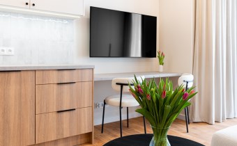 Kuchnia wyposażona jest w nowe urządzenia AGD: lodówko-zamrażarkę, zmywarkę, piekarnik, płytę indukcyjną oraz okap. Do dyspozycji pozostaje również telewizor. W mieszkaniu zamontowano klimatyzację, nowoczesne oświetlenie oraz drzwi wewnętrzne bezprzylgowe (ukryte zawiasy) z powłoką ułatwiającą utrzymanie czystości.