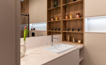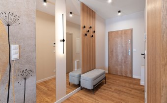 Wnętrze umeblowane zostało w zabudowy stolarskie wykonane na zamówienie: kuchnia, zabudowa w przedpokoju, pojemna szafa garderobiana, blat roboczy pełniący również funkcję stołu lub biurka, a także meble łazienkowe. Dodatkowo w cenie pozostają meble ruchome, m.in. rozkładany narożnik, stolik kawowy, krzesła oraz ławka.
