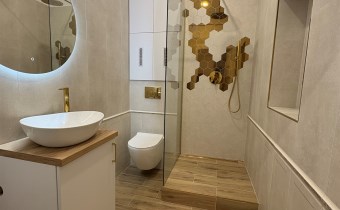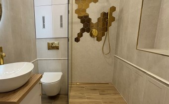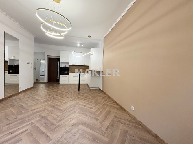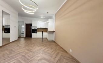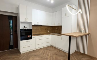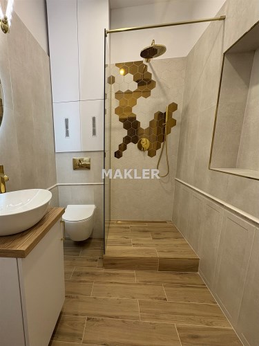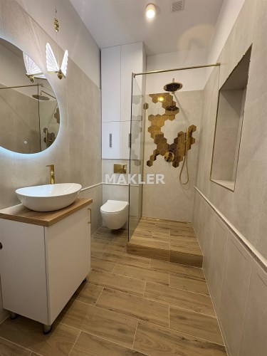 Mieszkanie zostało wyremontowane w 100% dzięki czemu zyskujesz kilkanaście lub więcej lat pewności i spokoju, że wszystko sprawnie działa. Właściciel zadbał o wymianę instalacji, piękne podłogi oraz nowoczesne i funkcjonalne meble w zabudowie kuchennej. Sprzęty AGD pozostają w cenie i są objęte gwarancją. W łazience biel połączona ze złotymi elementami komponuje się bardzo elegancko.