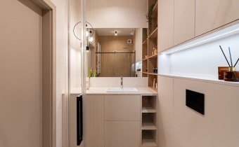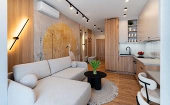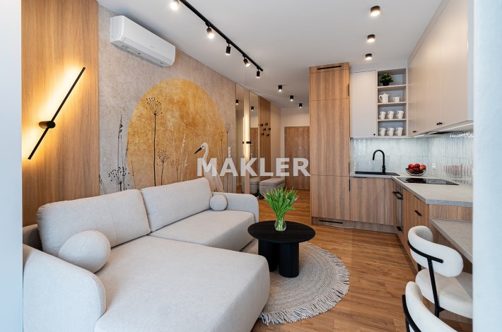 Mieszkanie zostało zaprojektowane przez architekta wnętrz i wykończone w wysokim standardzie z wykorzystaniem dobrej jakości materiałów. Przemyślany układ funkcjonalny obejmuje pokój dzienny z aneksem kuchennym, łazienkę oraz balkon. Pomimo niewielkiego metrażu, mieszkanie jest przestronne i dobrze doświetlone – zachodnia ekspozycja zapewnia dużo naturalnego światła.