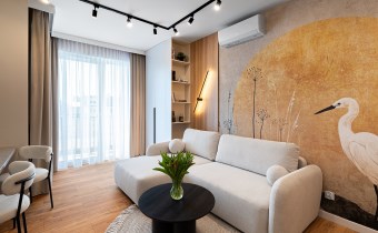 Mieszkanie zostało zaprojektowane przez architekta wnętrz i wykończone w wysokim standardzie z wykorzystaniem dobrej jakości materiałów. Przemyślany układ funkcjonalny obejmuje pokój dzienny z aneksem kuchennym, łazienkę oraz balkon. Pomimo niewielkiego metrażu, mieszkanie jest przestronne i dobrze doświetlone – zachodnia ekspozycja zapewnia dużo naturalnego światła.