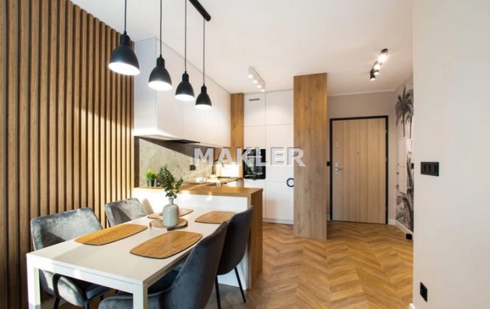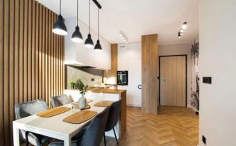 Mieszkanie urządzone wg indywidualnego projektu z wysokiej jakości materiałów. Kuchnia, zabudowy meblowe wykonane przez stolarza (systemy Blum)