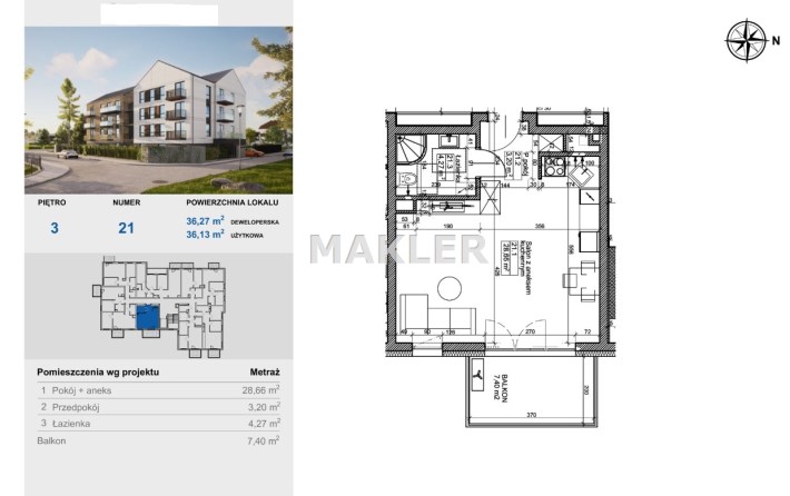 Przedstawiamy 2 pokojowe mieszkanie o powierzchni 36,13 m2 na 3 piętrze bloku z cichą windą.