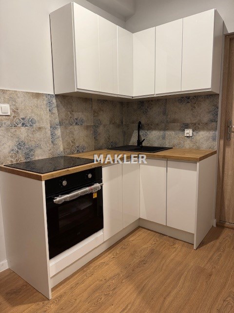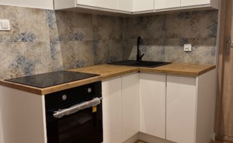 Kuchnia wyposażona w meble kuchenne oraz piekarnik i płytę indukcyjną.