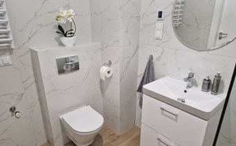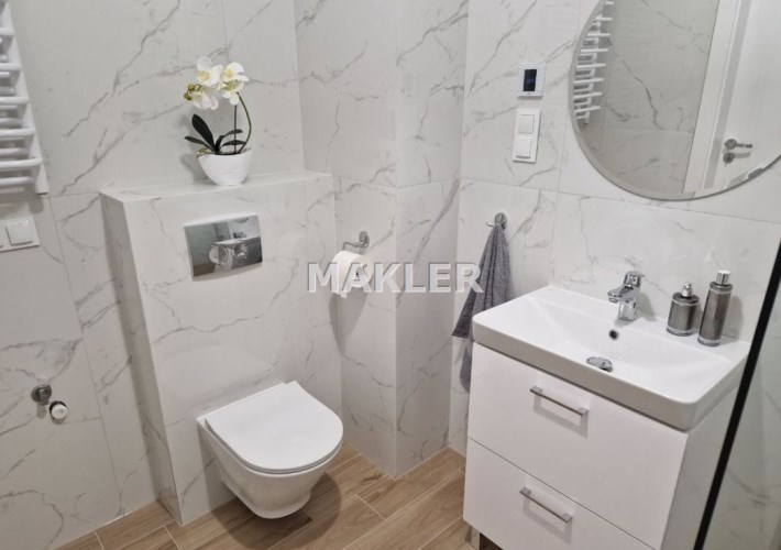 System inteligentnego sterowania mieszkaniem FIBARO umożliwiający m.in. zdalne sterowanie ogrzewaniem oraz roletami okiennymi. Ogrzewanie podłogowe (brak grzejników daje większe możliwości aranżacji pomieszczeń). Panoramiczne okna trzyszybowe z roletami. Deska kompozytowa na balkonie.
