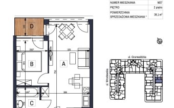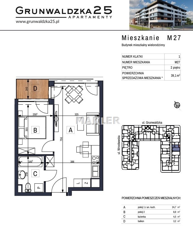 Na sprzedaż 2 pokojowe mieszkanie z balkonem o powierzchni 39,05 m2, usytuowane na II piętrze pięciokondygnacyjnego budynku z windą przy ulicy Grunwaldzkiej 25, oddanym do użytku IV kw. 2023.