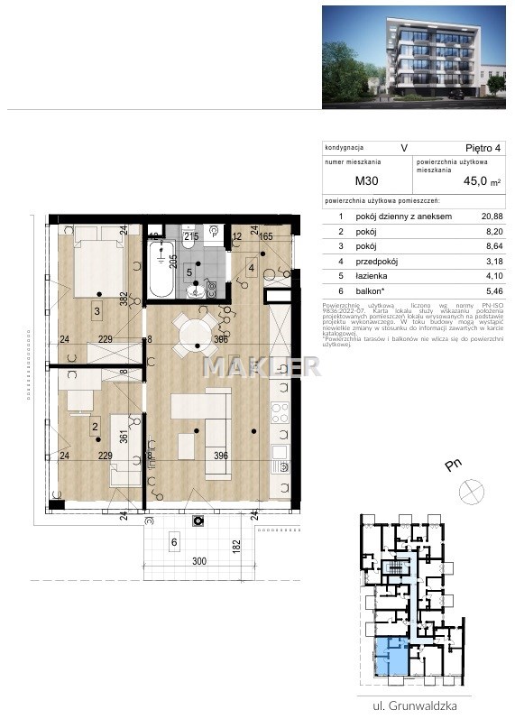 Mieszkanie 3 pokojowe o powierzchni 45m2, na 4 piętrze nowo powstałego budynku.
