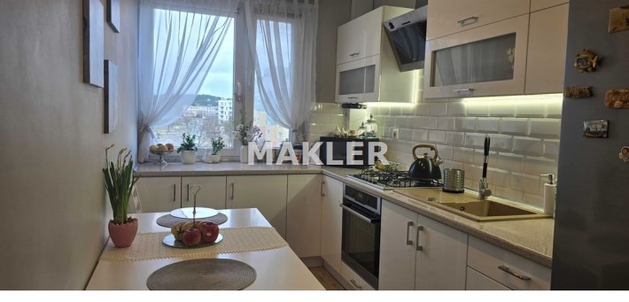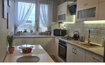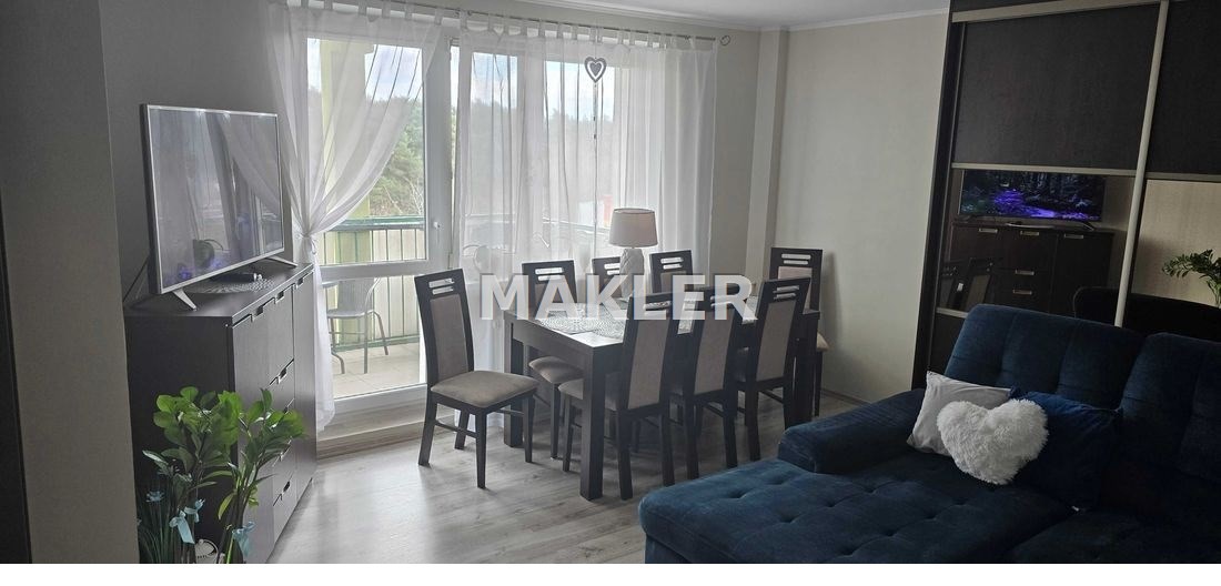Dużym atutem nieruchomości jest jej bardzo dobre doświetlenie — okna wychodzą na trzy strony świata, dzięki czemu wnętrze jest jasne i komfortowe przez cały dzień. Z balkonu rozciąga się widok na las, a samo położenie mieszkania zapewnia ciszę i przyjemne otoczenie.