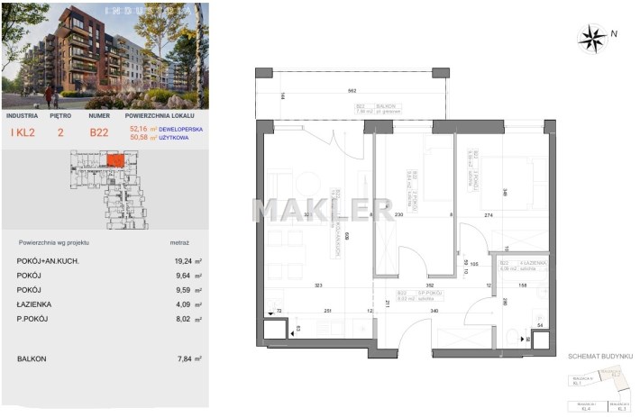 Przedstawiamy 3 pokojowe, mieszkanie o powierzchni 50,58m2 na 2 piętrze nowoczesnego bloku z windą i dużym balkonem.