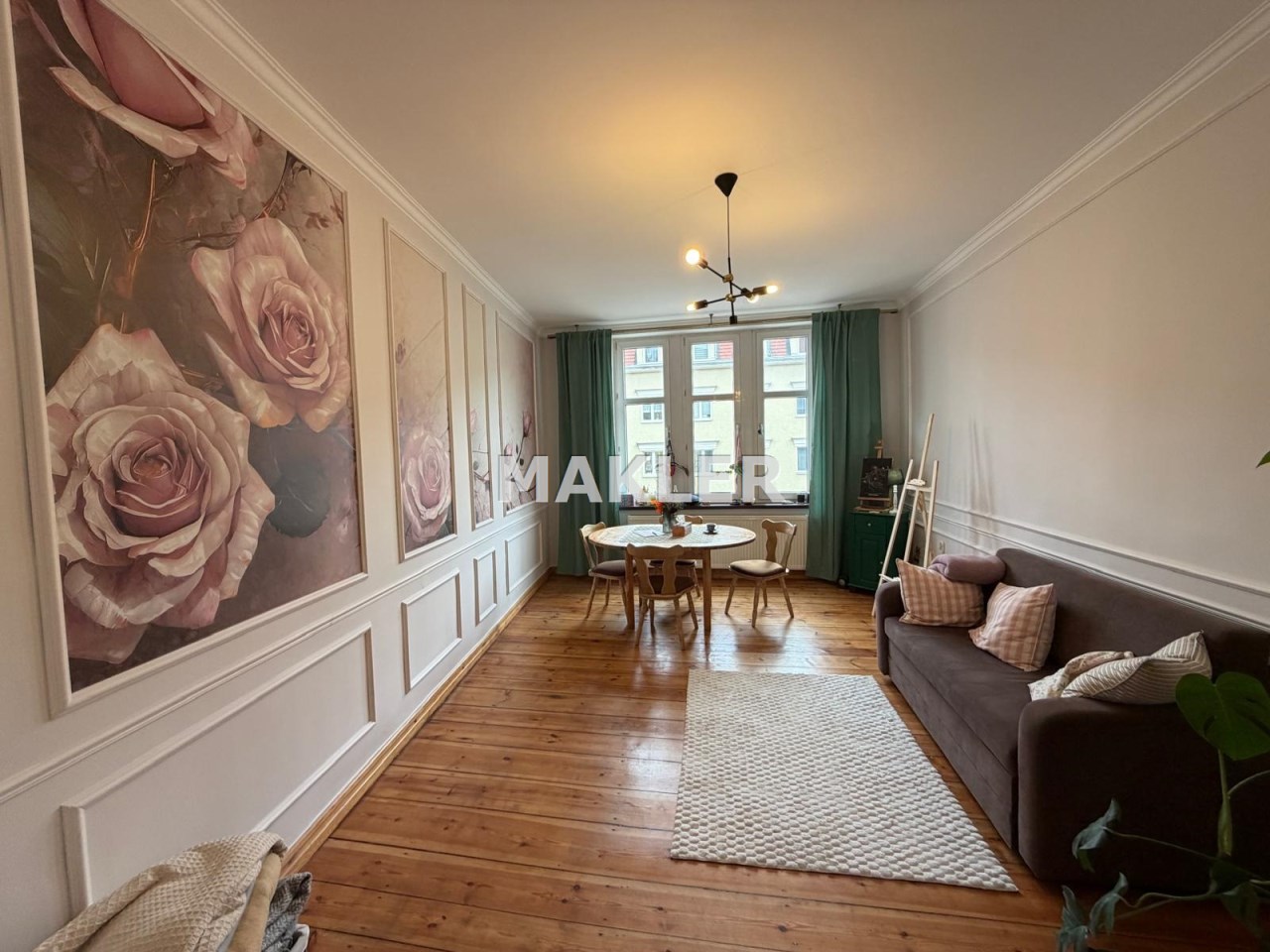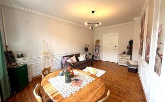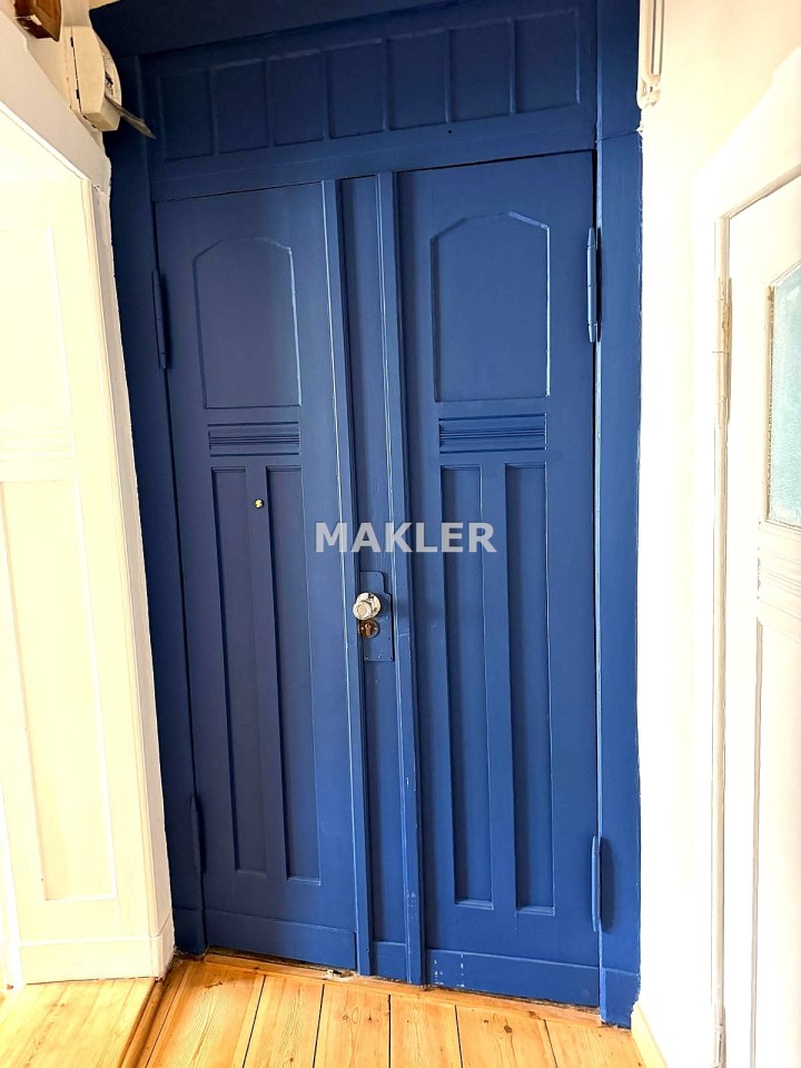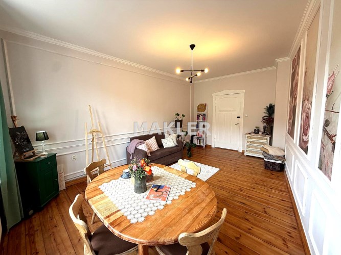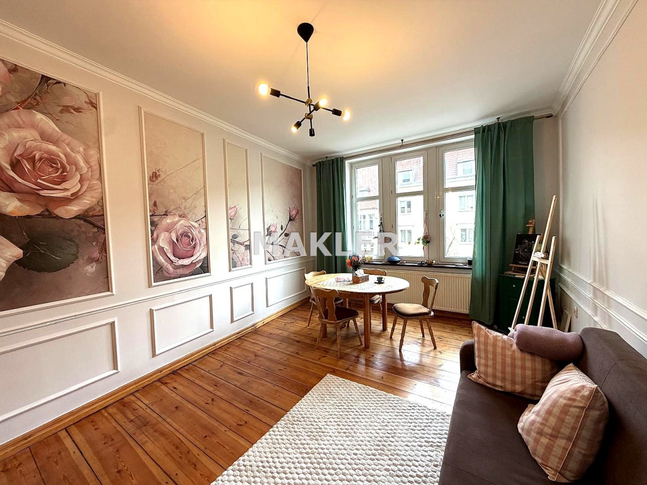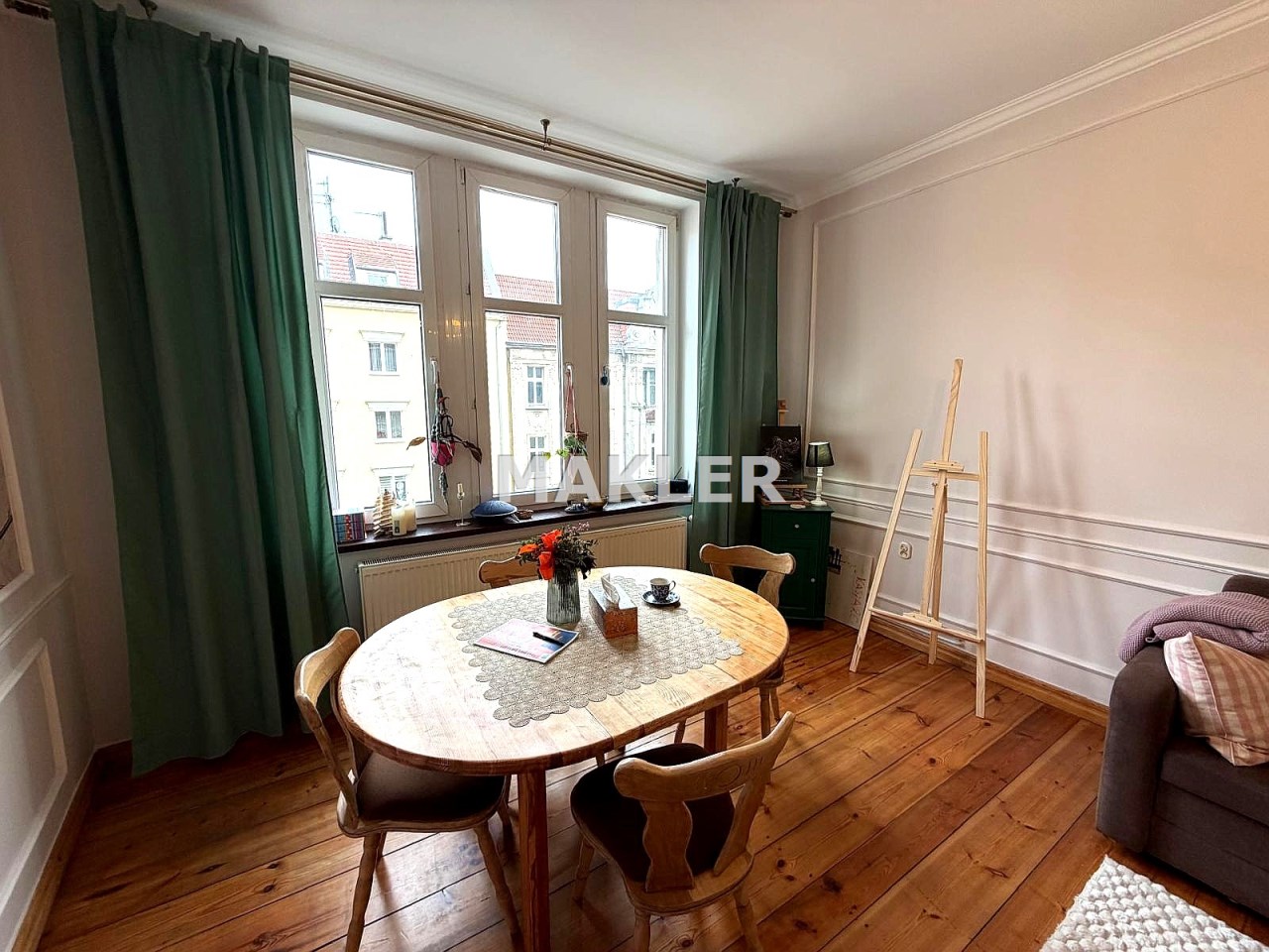 Na podłogach zachowane zostały piękne, drewniane deski, które idealnie wpisują się w charakter kamienicy.