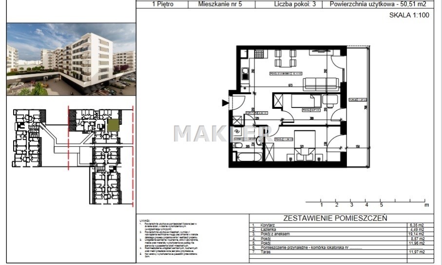3 pokoje 60,64 m2 10 400,00 zł/m2