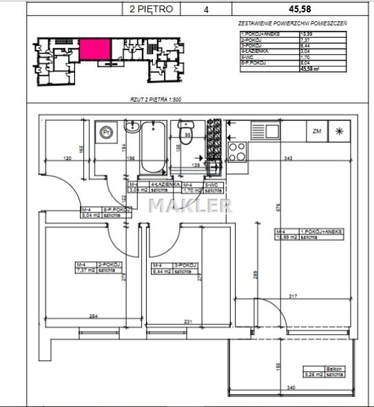 Przedstawiamy 3 pokojowe mieszkanie o powierzchni 45,58 m2 na 2 piętrze w bloku usytuowanym w bliskości pięknych terenów zielonych.