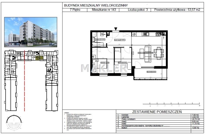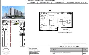 Przedstawiamy 3 pokojowe mieszkanie o powierzchni 53,57 m2 na 7 ( ostatnim ) piętrze bloku z cichą windą.