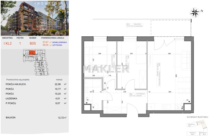 Przedstawiamy 3 pokojowe, mieszkanie o powierzchni 56,05m2 na 1 piętrze nowoczesnego bloku z windą i balkonem.
