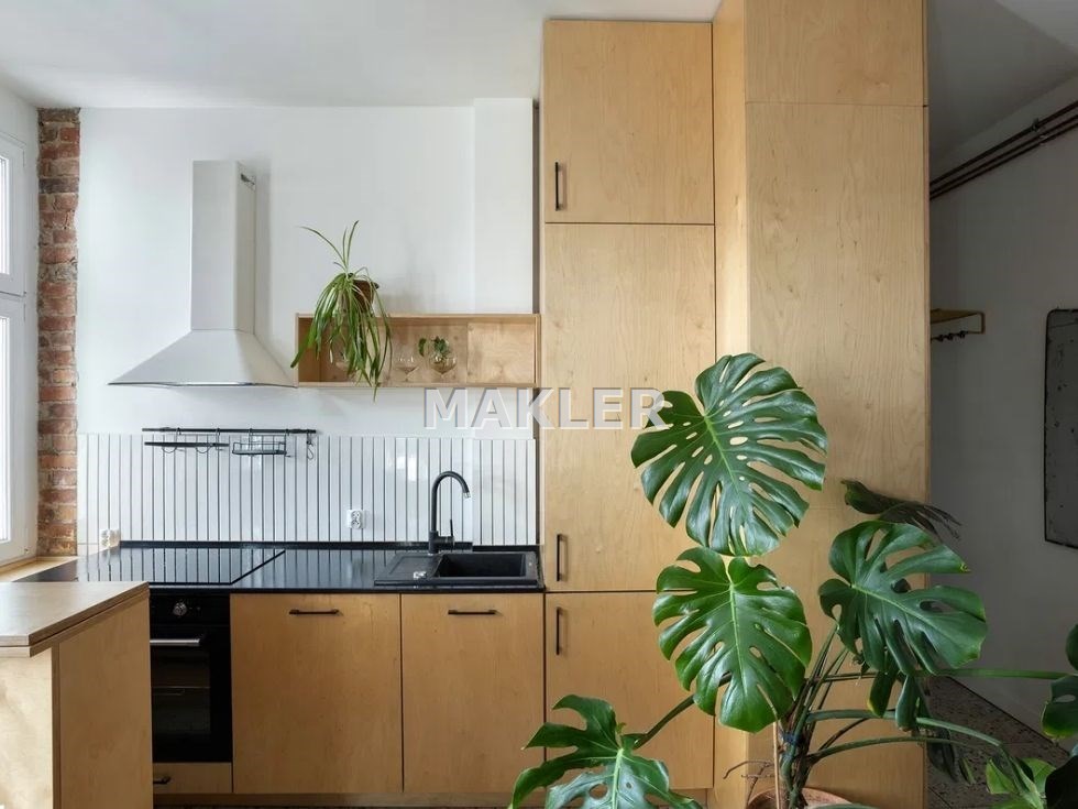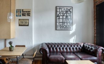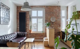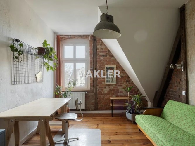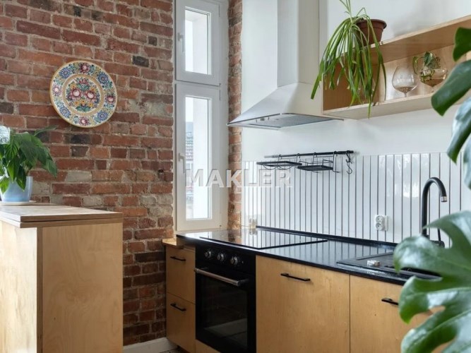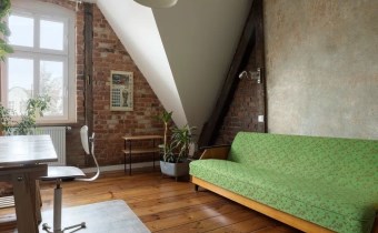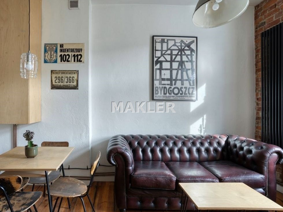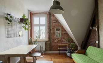 Odsłonięte ściany ukazują ponad stuletnią cegłę oraz doskonale zachowaną konstrukcję więźby dachowej, stanowiąc piękne nawiązanie do historii budynku.